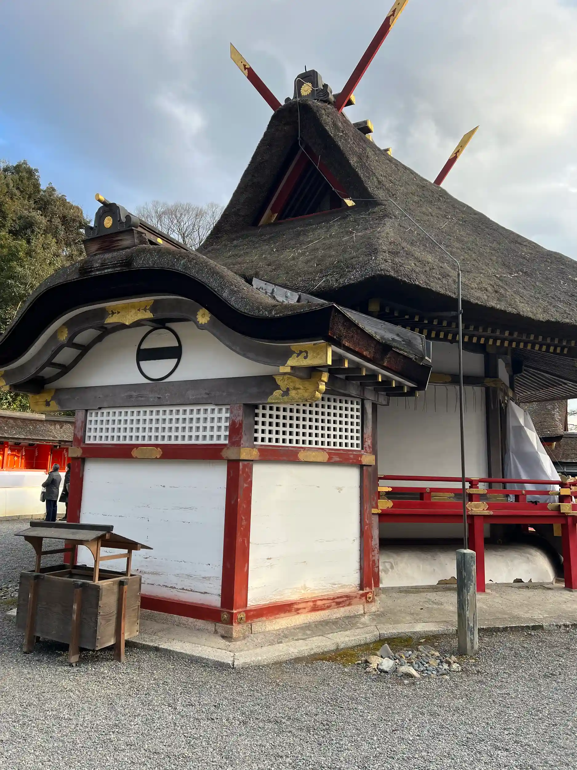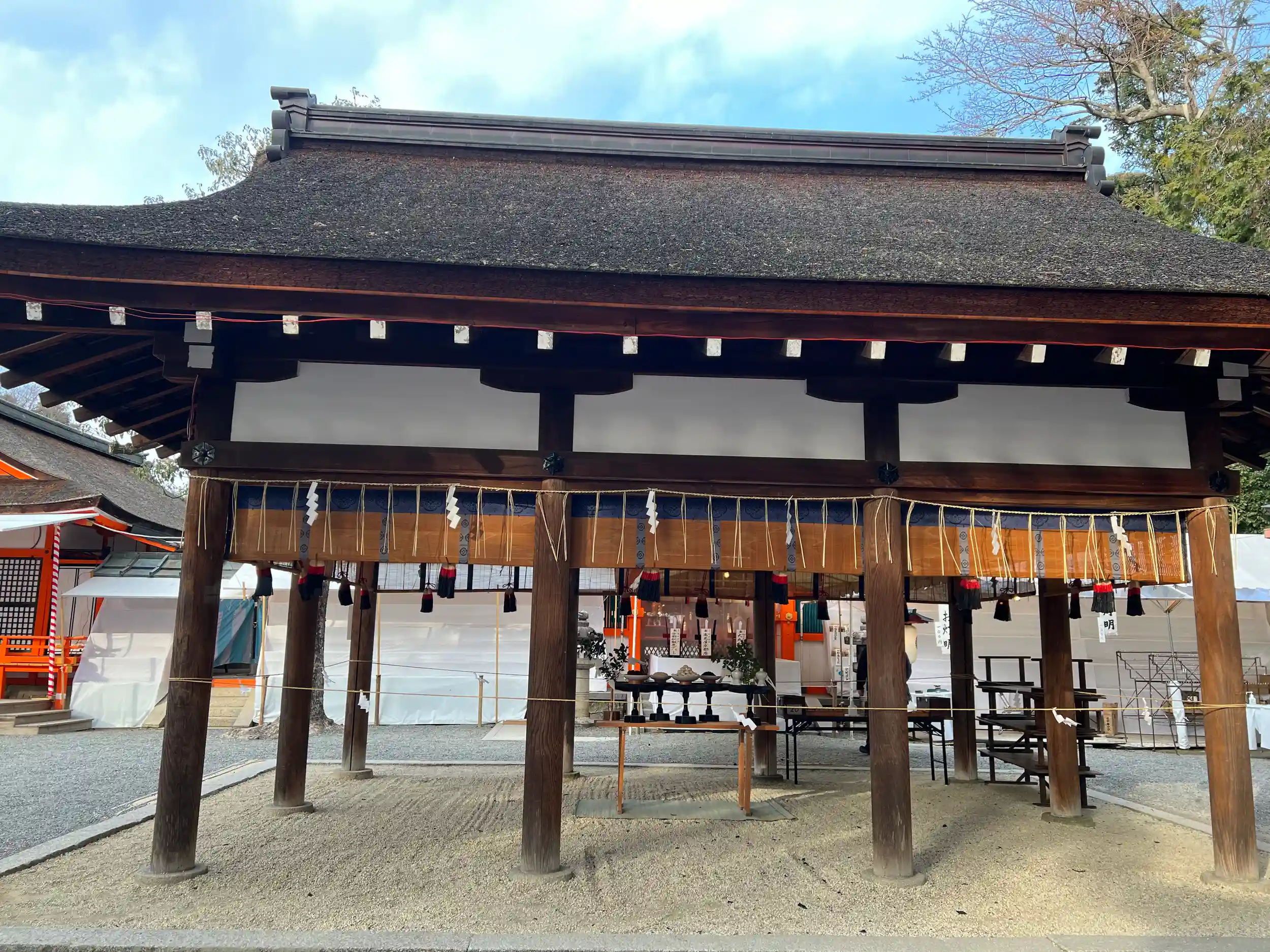 本殿は独特の雰囲気の建築様式で重要文化財。慶長6年(1601年)の建築で、平面上八角形に、六角形の後房を付した、京都で類似するような例がない珍しい形。屋根も茅葺。比類なき存在感。これは、密教、儒教、陰陽道、道教など諸宗教、諸思想を統合しようとした吉田神道の理想を形に表したものと言われています。もとは左京室町の卜部(吉田)家邸内にあったものを、文明16年(1484年)吉田神道を創設した吉田兼倶が移設。現在でも節分祭の特殊神事は神職のみで執り行われているようです。