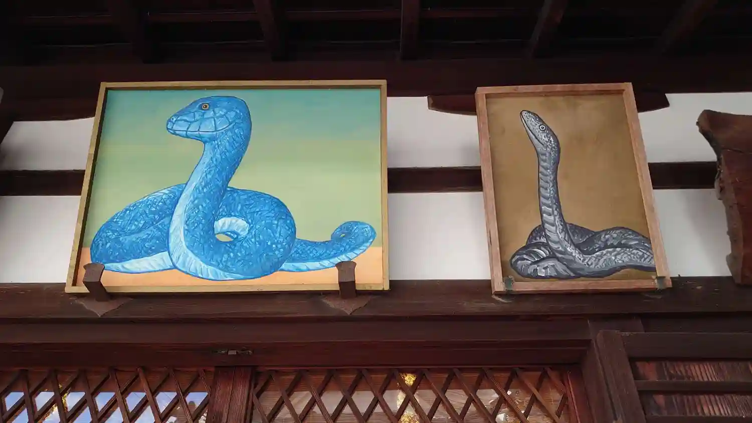 蛇の絵馬が軒先にあり