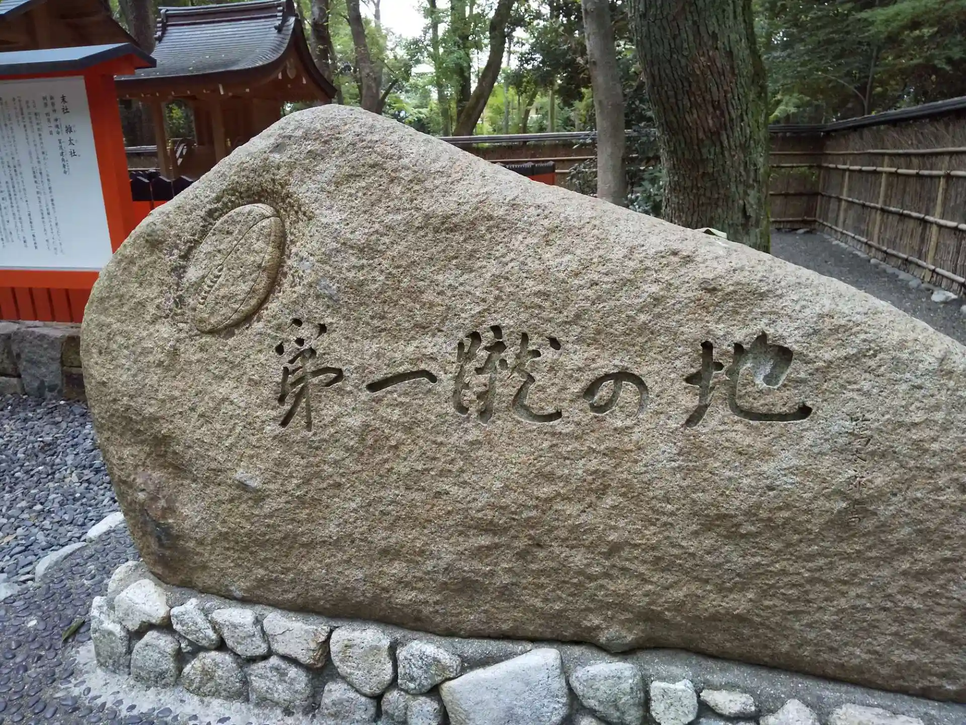 明治43年(1910)、糺の森で関西初のラグビー練習が行なわれたことから「第一蹴の地」の石碑が😄