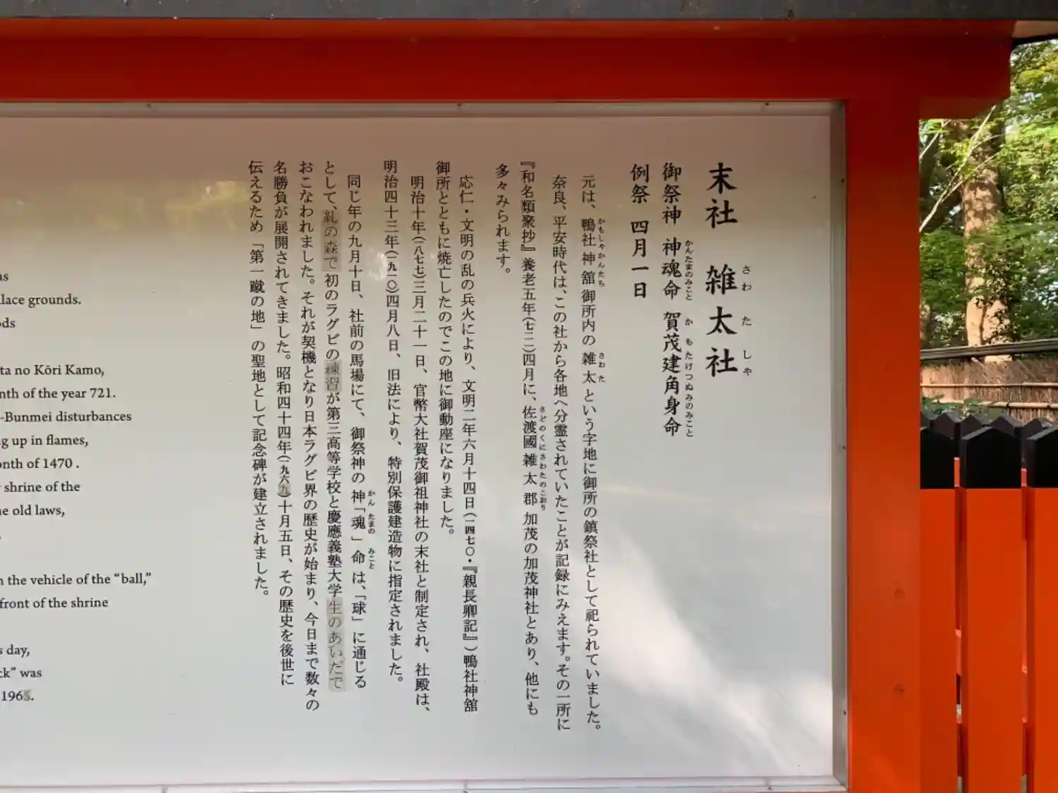雑太社は、ラグビー第一蹴の地にある下鴨神社の末社です。