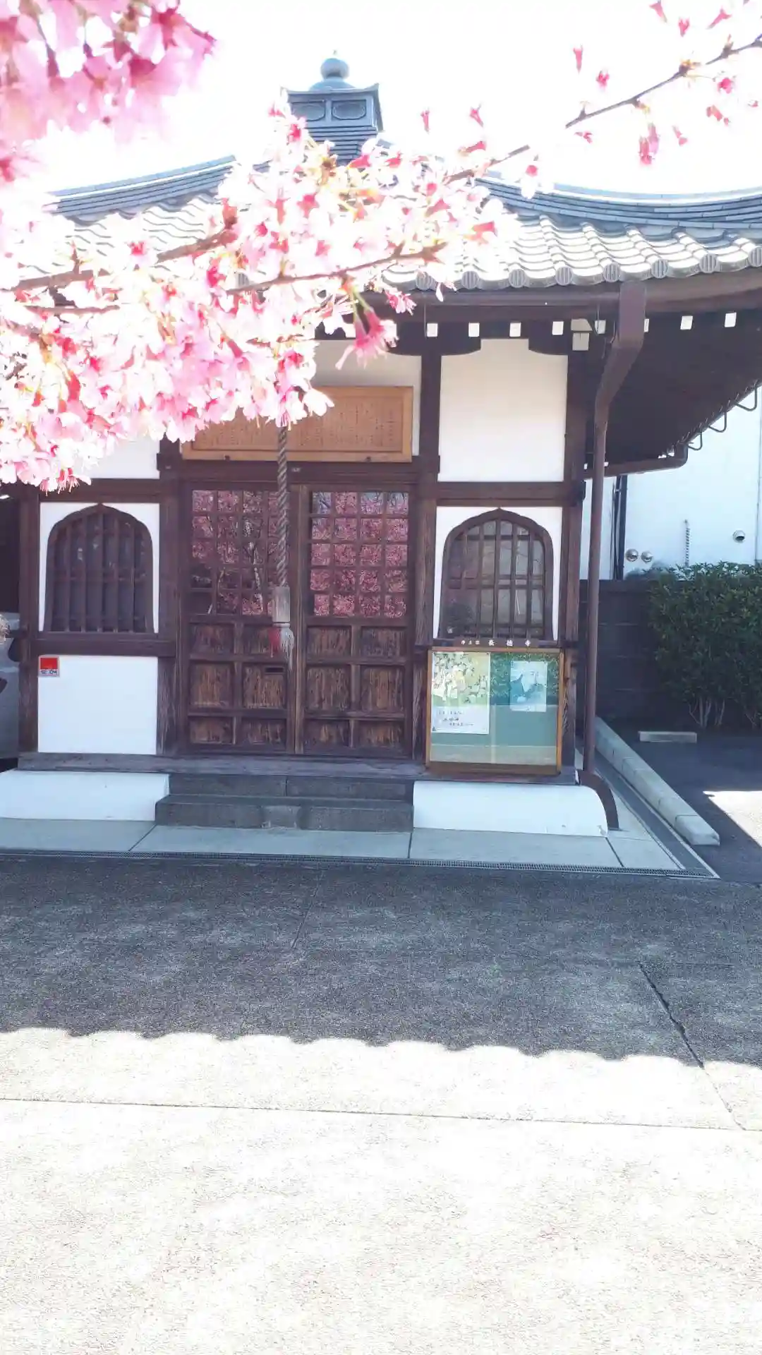お堂のガラスに桜が映ってとても素敵❗