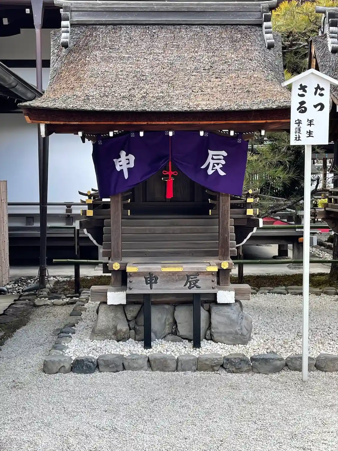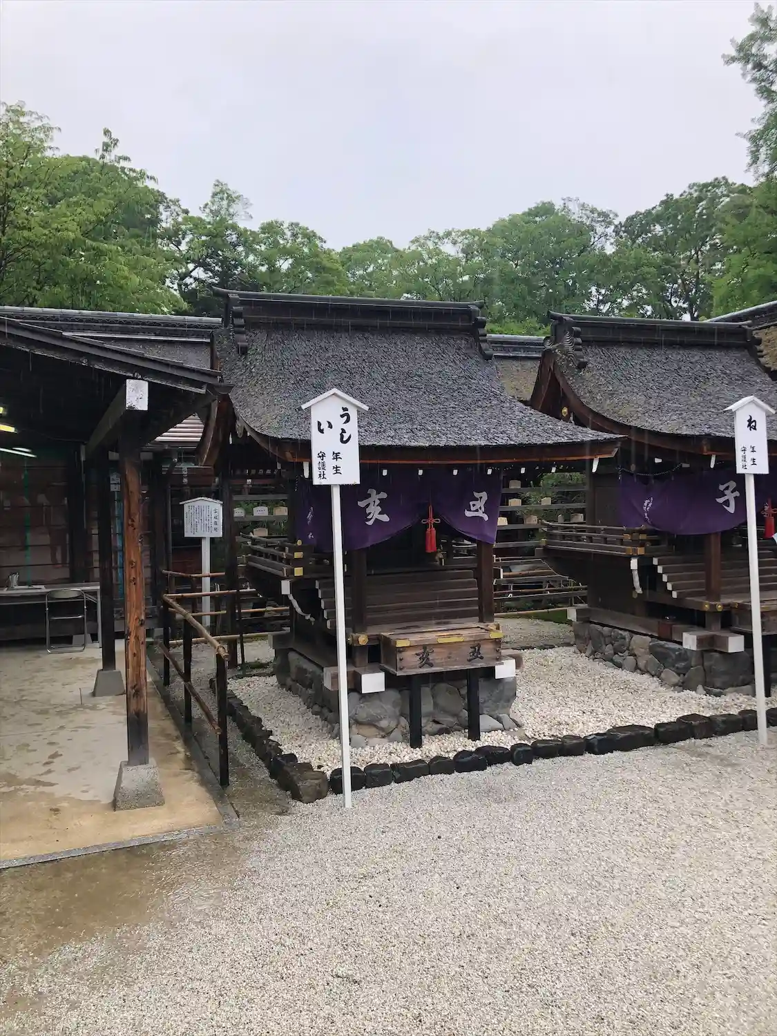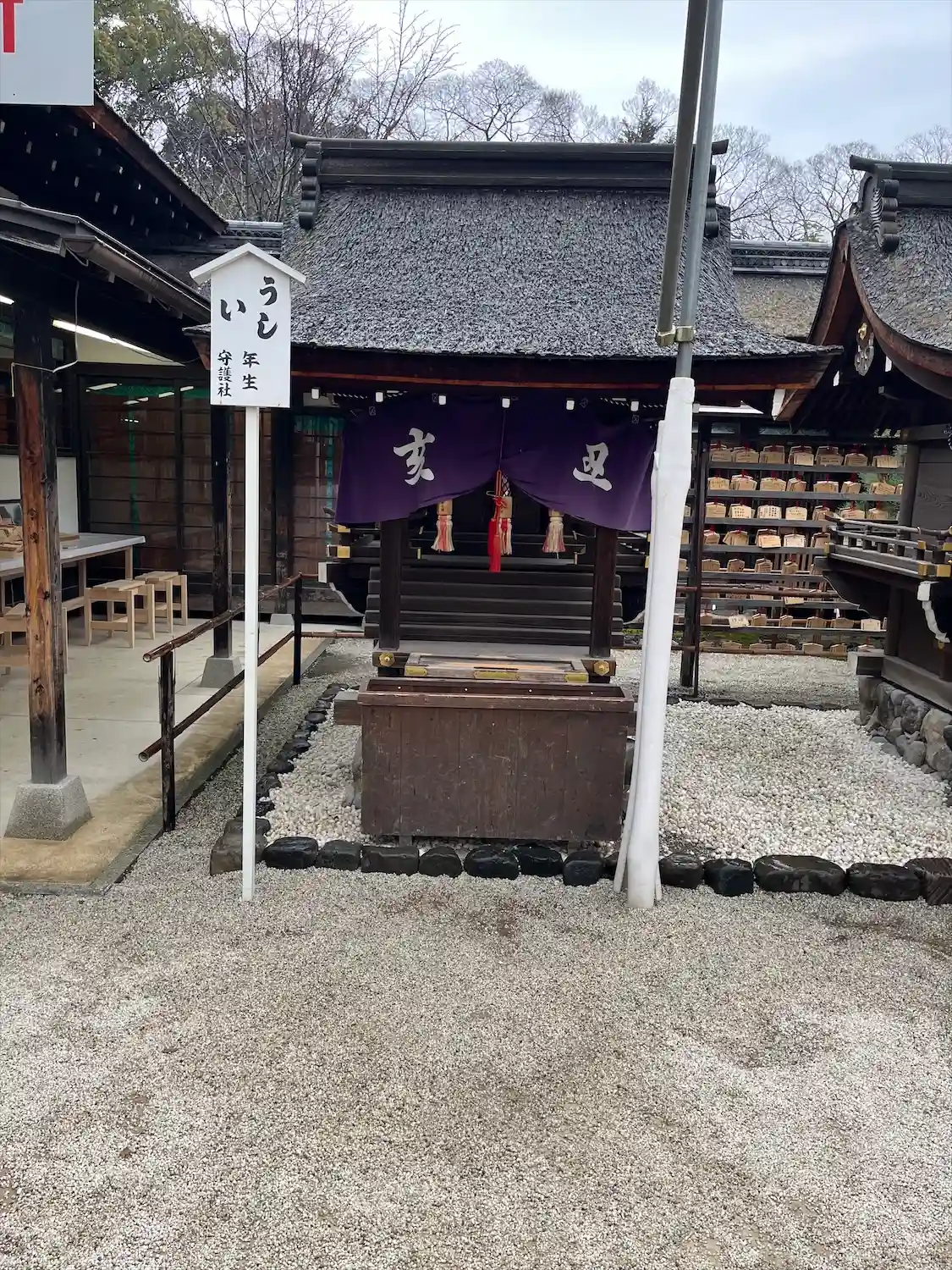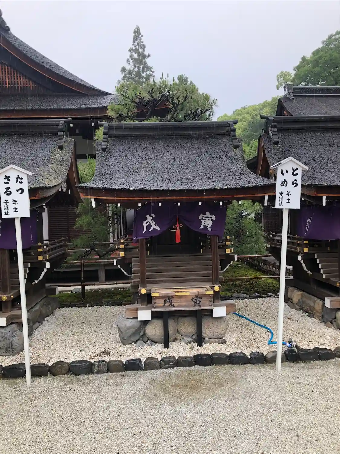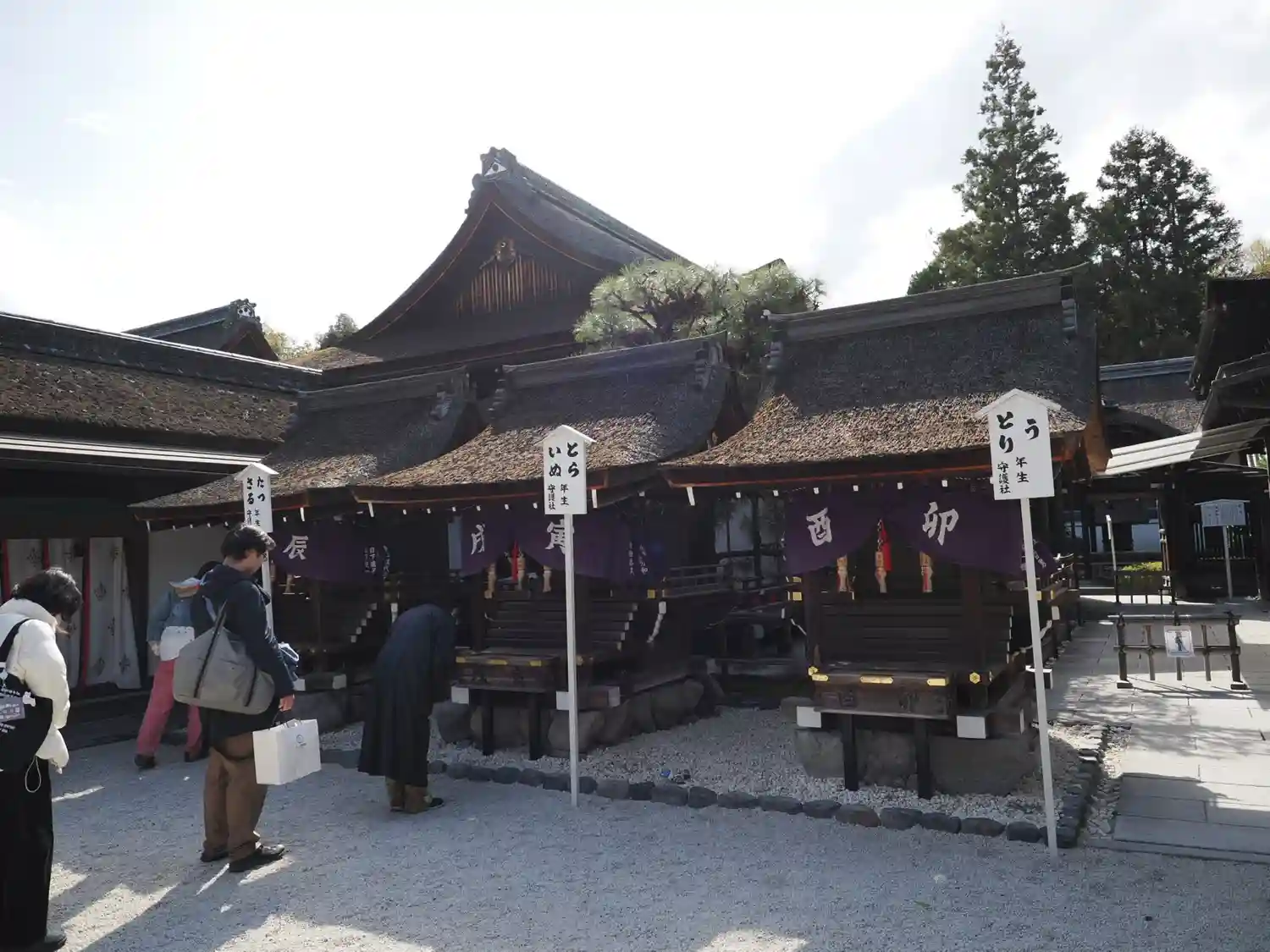 言社。中門をくぐると言社と呼ばれる7つの小さなお社があり、それぞれに干支が祀られています。自分の干支にあたる言社にお参りをさせてもらいました。