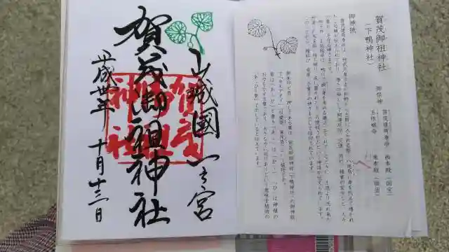 真ん中に賀茂御祖神社(かもみおやじんじゃ)、右に山城国一之宮と書かれ、右上に社紋である双葉葵の印、真ん中に賀茂御祖神社の社印が押されています。