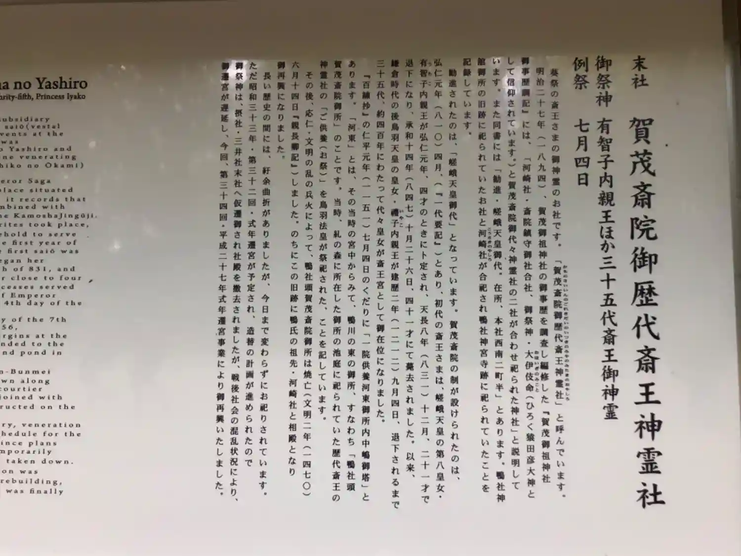 賀茂斎院御代斎王神霊社由緒書き