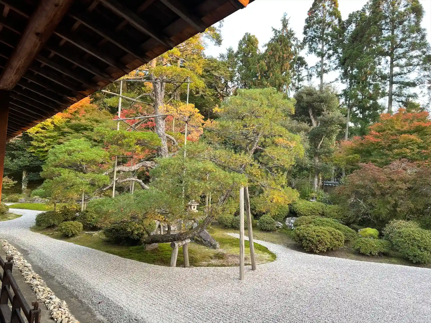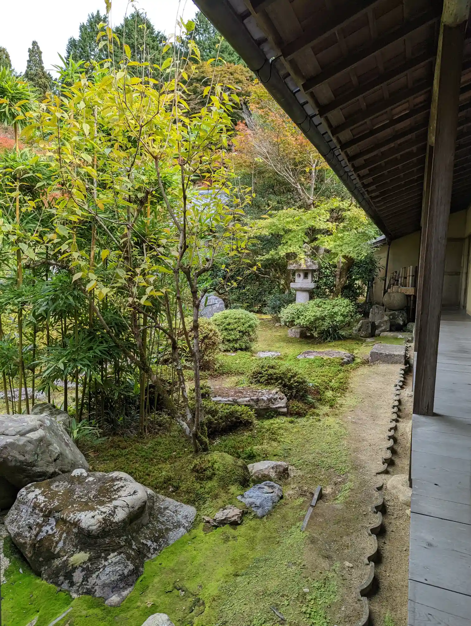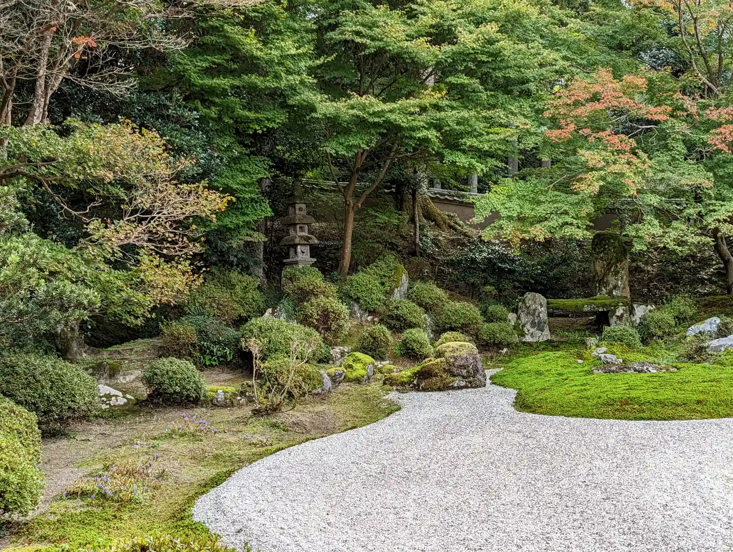 苔と白壁と紅葉のグラデーション。綺麗です。