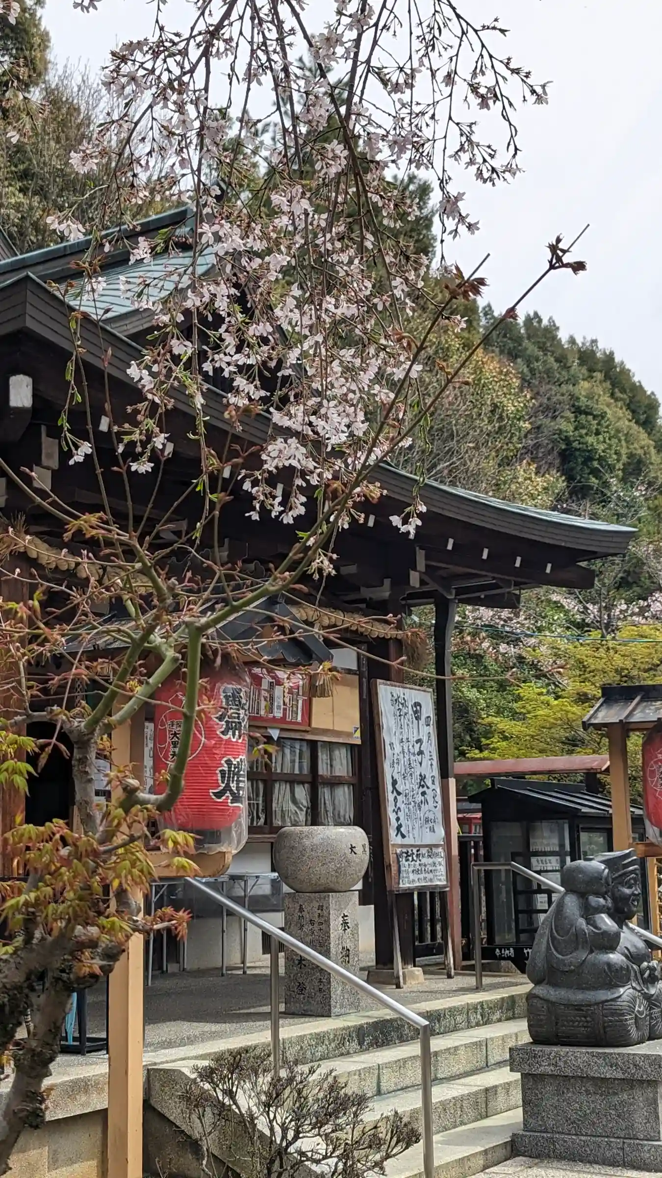 4月30日の甲子大祭の御朱印をいただきに。桜も終わり静けさが漂います😅自販機の画が金太郎に変わって…