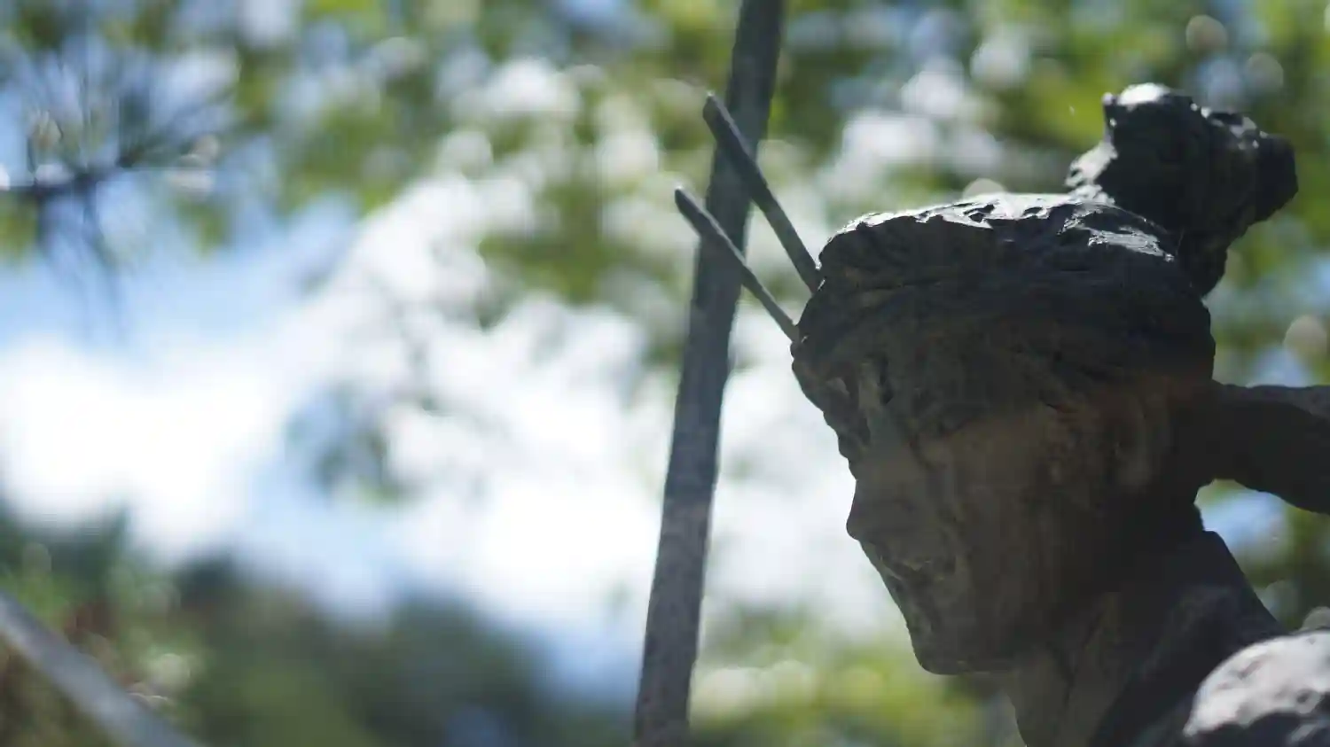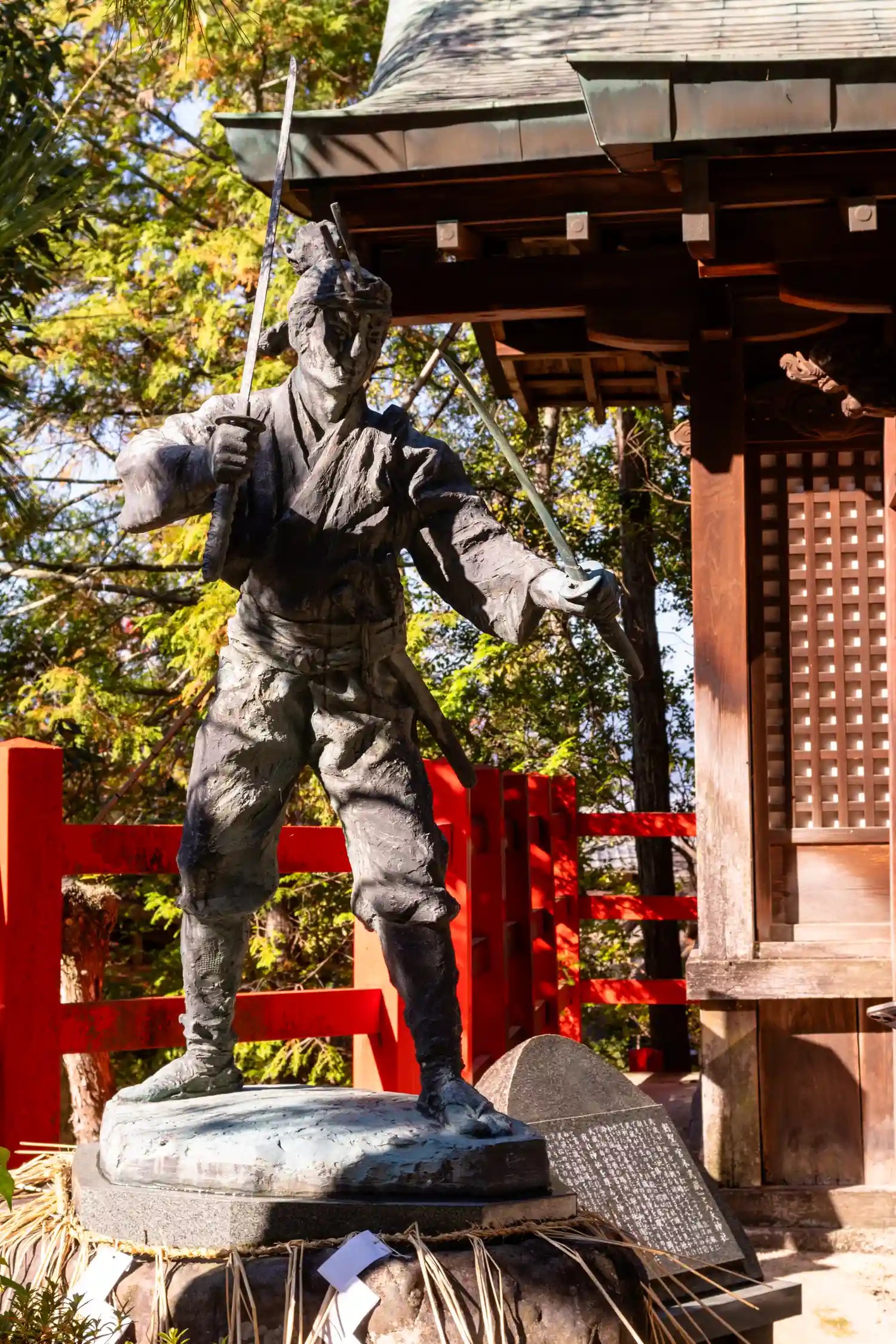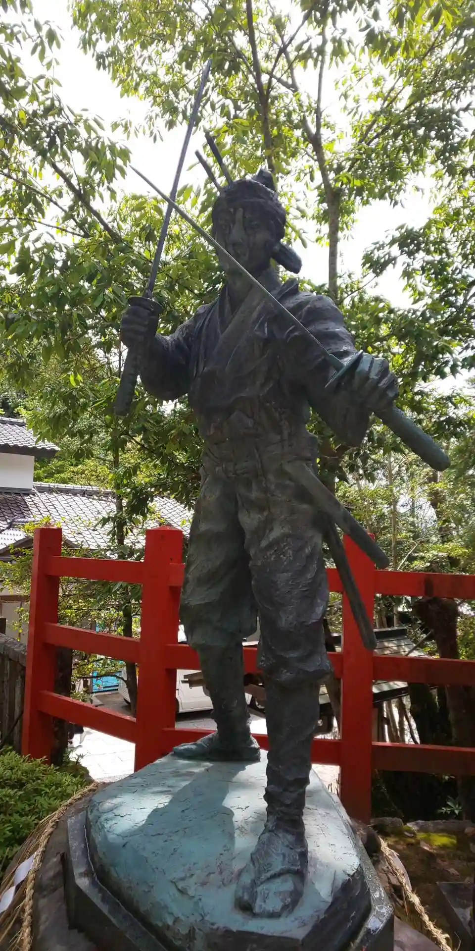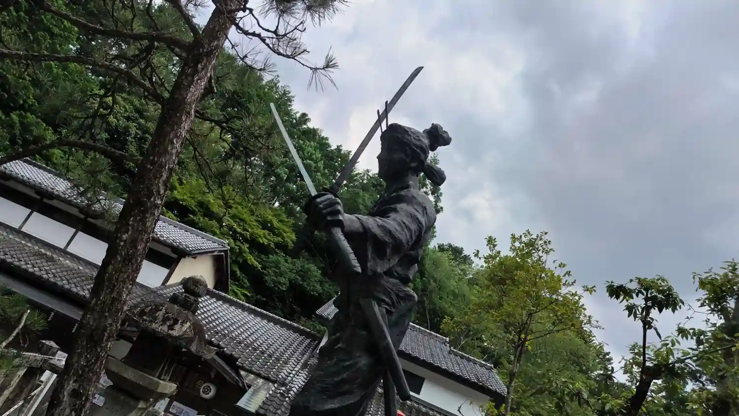武蔵像は二刀流なので刀2本持っ…