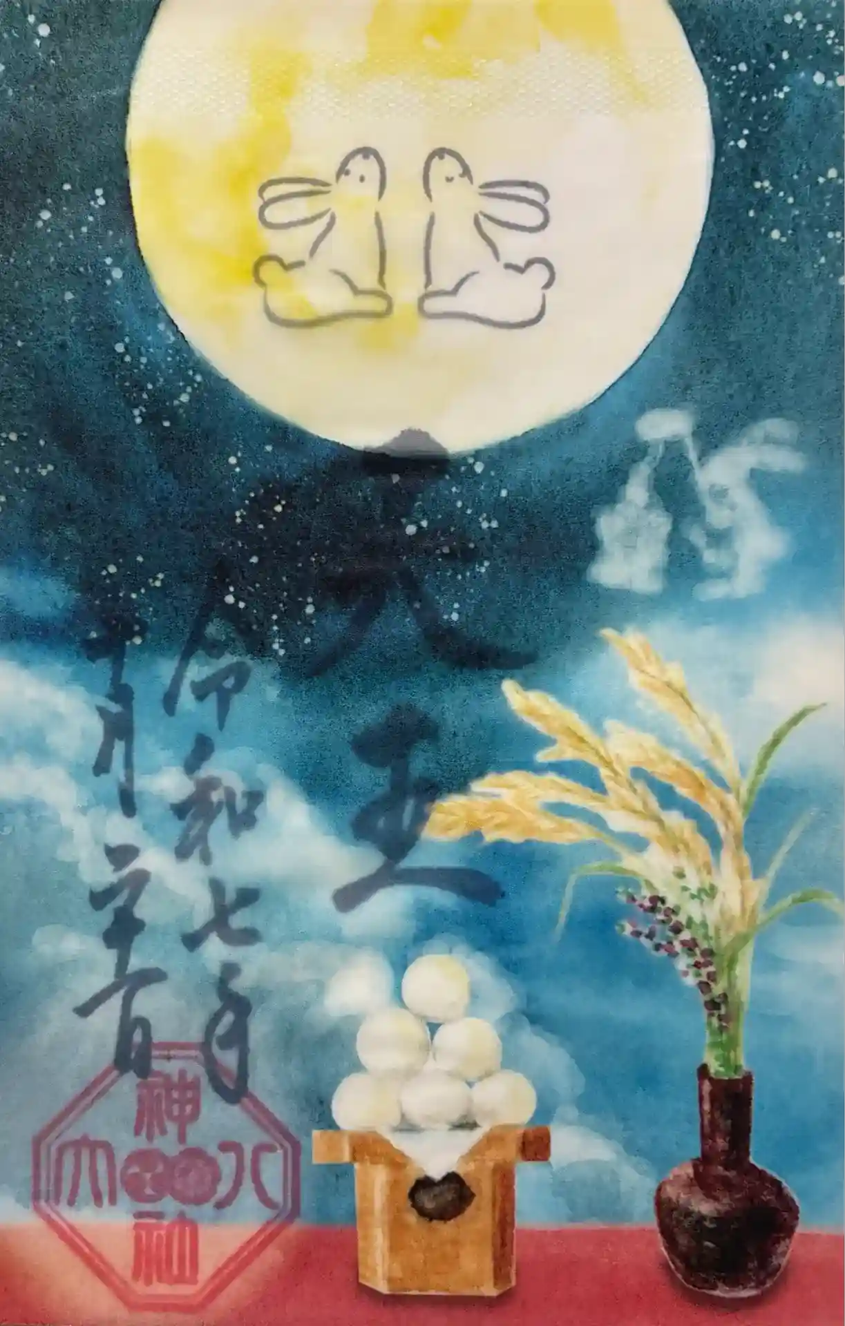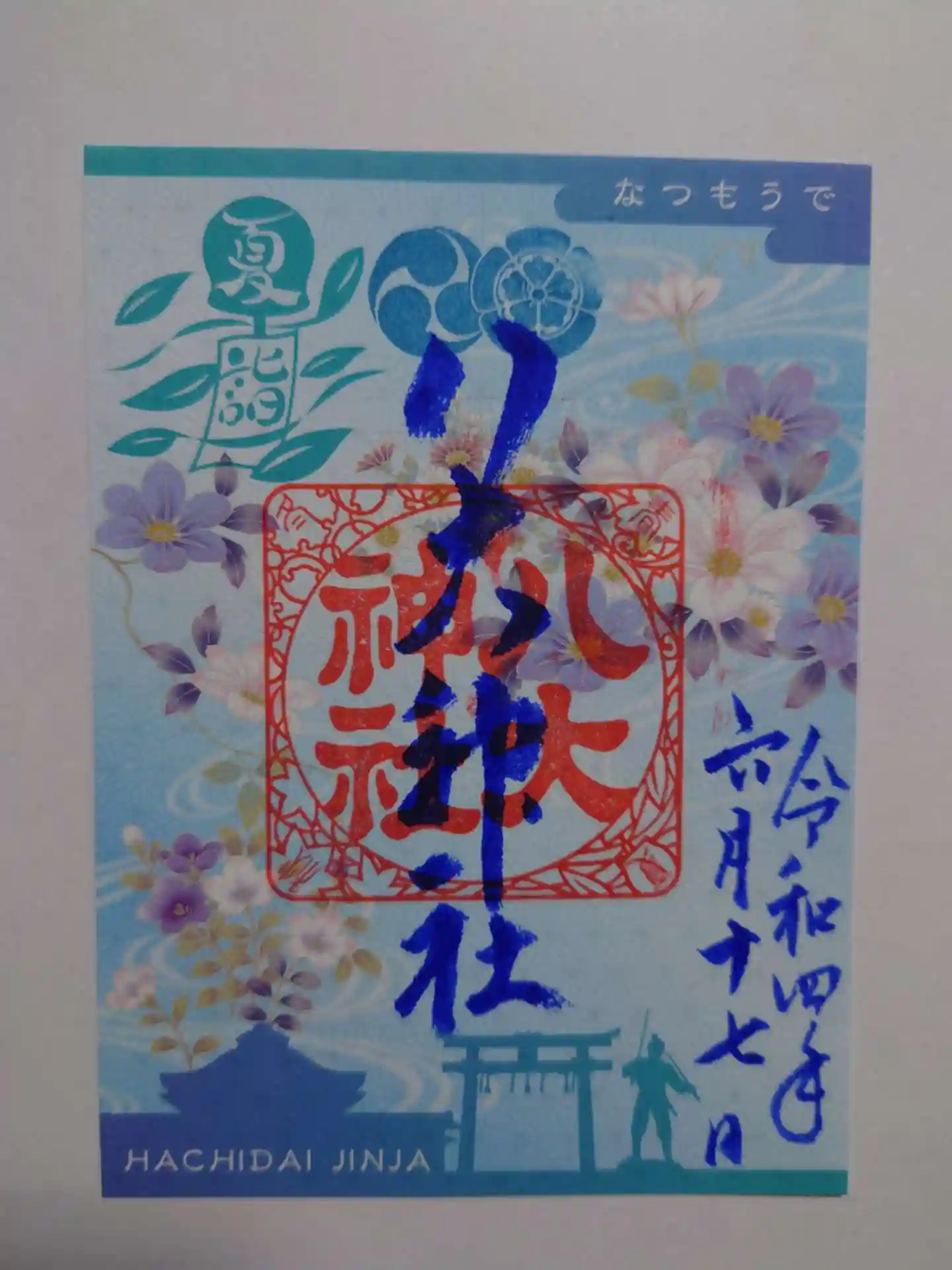 鉄線、桔梗、夏菊などの夏の花々が爽やかな色合いの中に描かれた夏詣御朱印。
