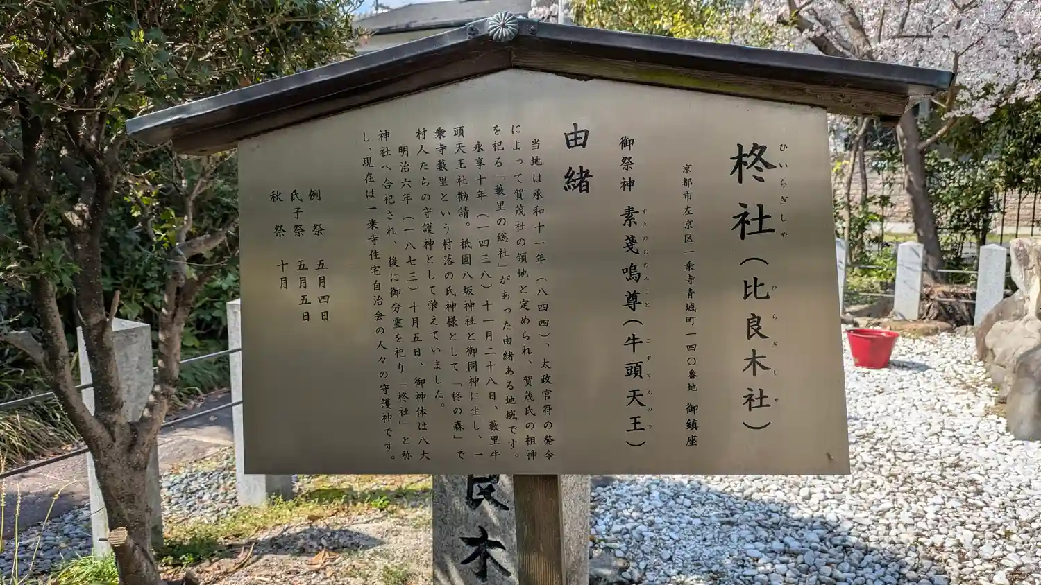 御祭神は素戔嗚尊。社号からして下鴨神社の比良木神社(出雲井於神社)と同じでしたので関連あるのかなぁと思ったらどうやら賀茂氏の祖神を祀る「藪里の総社」があった地域のようです。八坂神社と同神の牛頭天皇を勧請とありました。京都あるあるのこんな町中に埋もれた由緒ある神社の一つですかね😅桜の超穴場なのは間違いないです。八大神社管理の様なので詳しいことは今度八大さんで聞いてみよう。