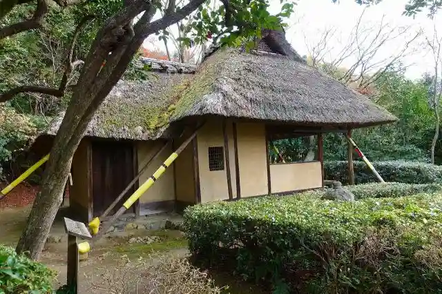 茅葺き屋根の庵で、内部は千利休が造った待庵に似た三畳台目の茶室となっています。