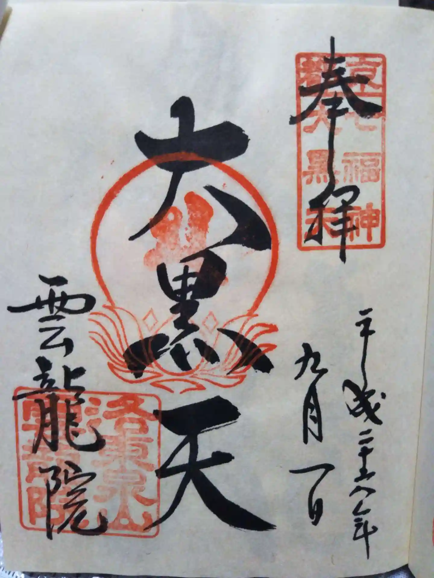 ご本尊は薬師如来様です。訪れると、まずは龍が描かれた屏風が出迎えてくださいます。こじんまりとした、とても落ち着ける寺院です。大内蔵之介の自筆の書を拝見することもできました。皇室縁の寺院らしく庭園には菊の御紋が…。走る大黒様でも知られている雲龍院さん。