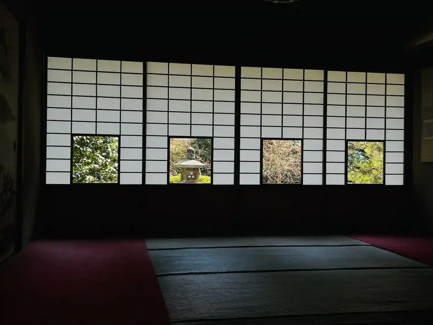 悟りの窓は本来紅梅が窓から見えるはずが、今年は咲かなかったそう。残念