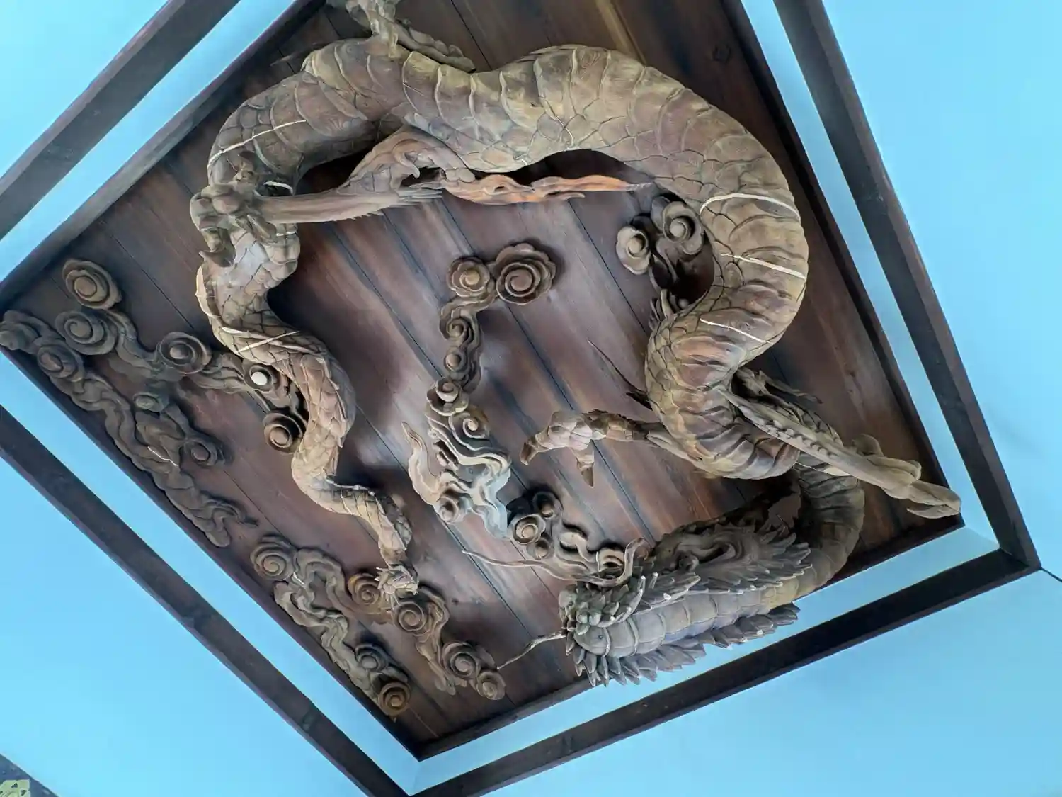 さほど広くない敷地に関わらず、本殿は、平安京以前からの降雨・止雨、水を司る龍神、高龗神(たかおかみのかみ)を祀った絢爛豪華な貴船神社奥院旧殿が移築され、社殿、拝殿に九山新太郎・作の数多くの目入れをされ、生き生きと立体感溢れる造形の彫物で整備され、そして、巨大な龍の彫物は拝殿の天井に据えられています。
