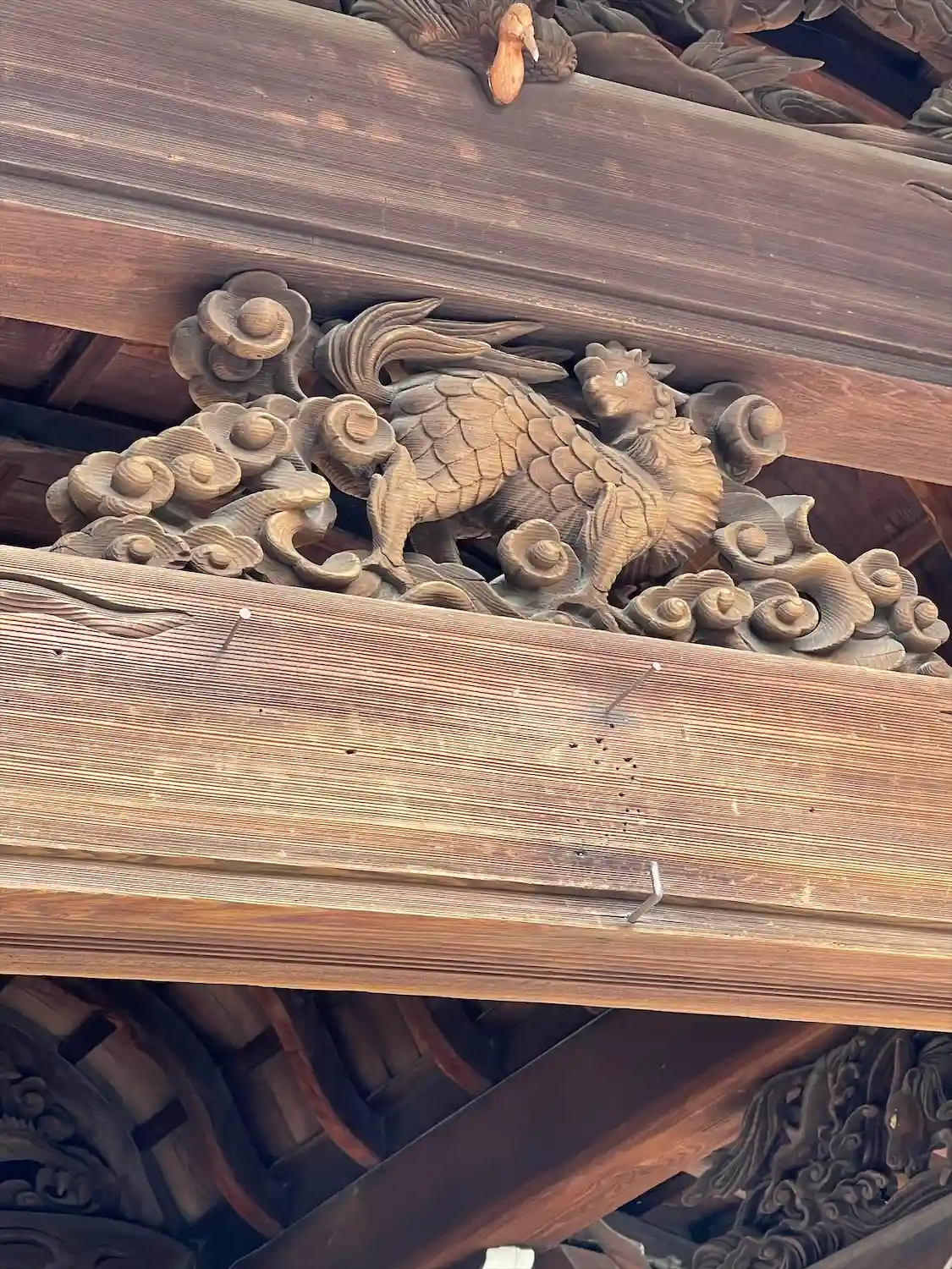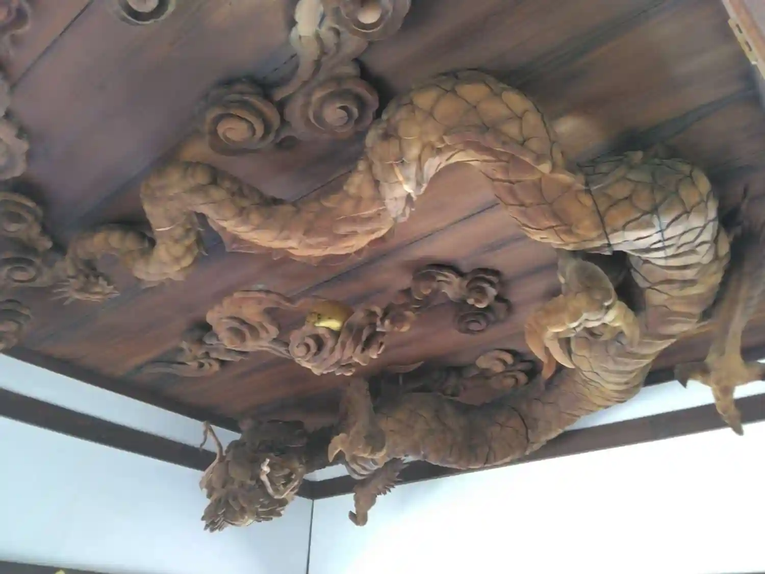 お寺さんによく神龍の天井図というのがありますが、こちらの天井には彫り物のどでかい神龍です!他にも見…