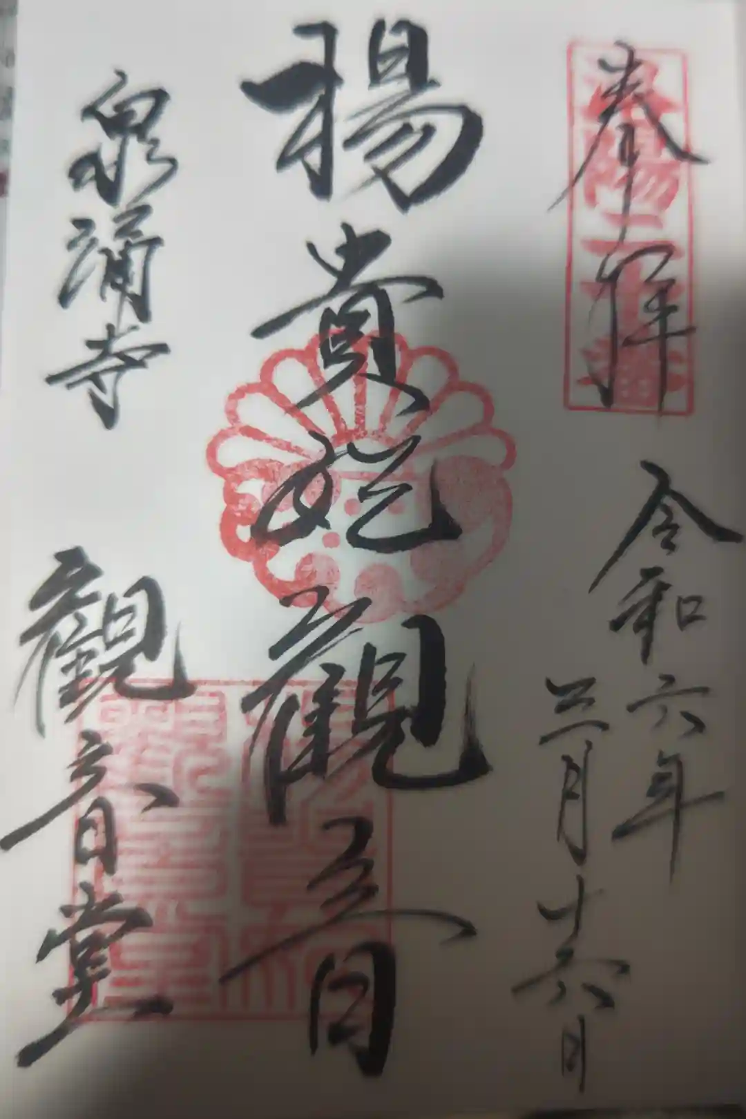 真ん中に楊貴妃観音と書かれ、右上に洛陽二十番の印、真ん中に菊と浪の重ね紋の印、左に泉涌寺観音堂の文字、左下に楊貴妃観音堂の印が押されています。
