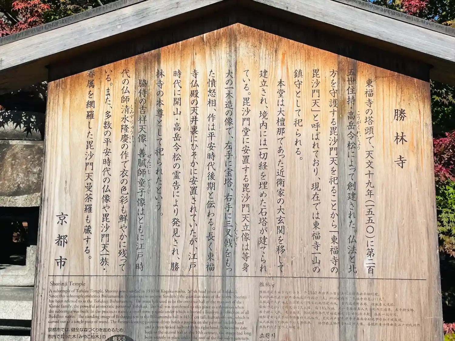 こちらも特別拝観で。いつも非公開のご本尊・毘沙門天の威風堂々とした姿を拝む。東福寺仏殿の天井に安置されていたものを江戸時代に発見しこちらに移されたという仏像だ。吉祥天と童子の三尊像として祀られている。それまでの本尊もお前立ちとしてお立ちになっている。どちらも平安期の像。本殿は大檀那であった九条家の玄関が移築されたもの。毘沙門天像を見上げるように、傾斜して建てられている。