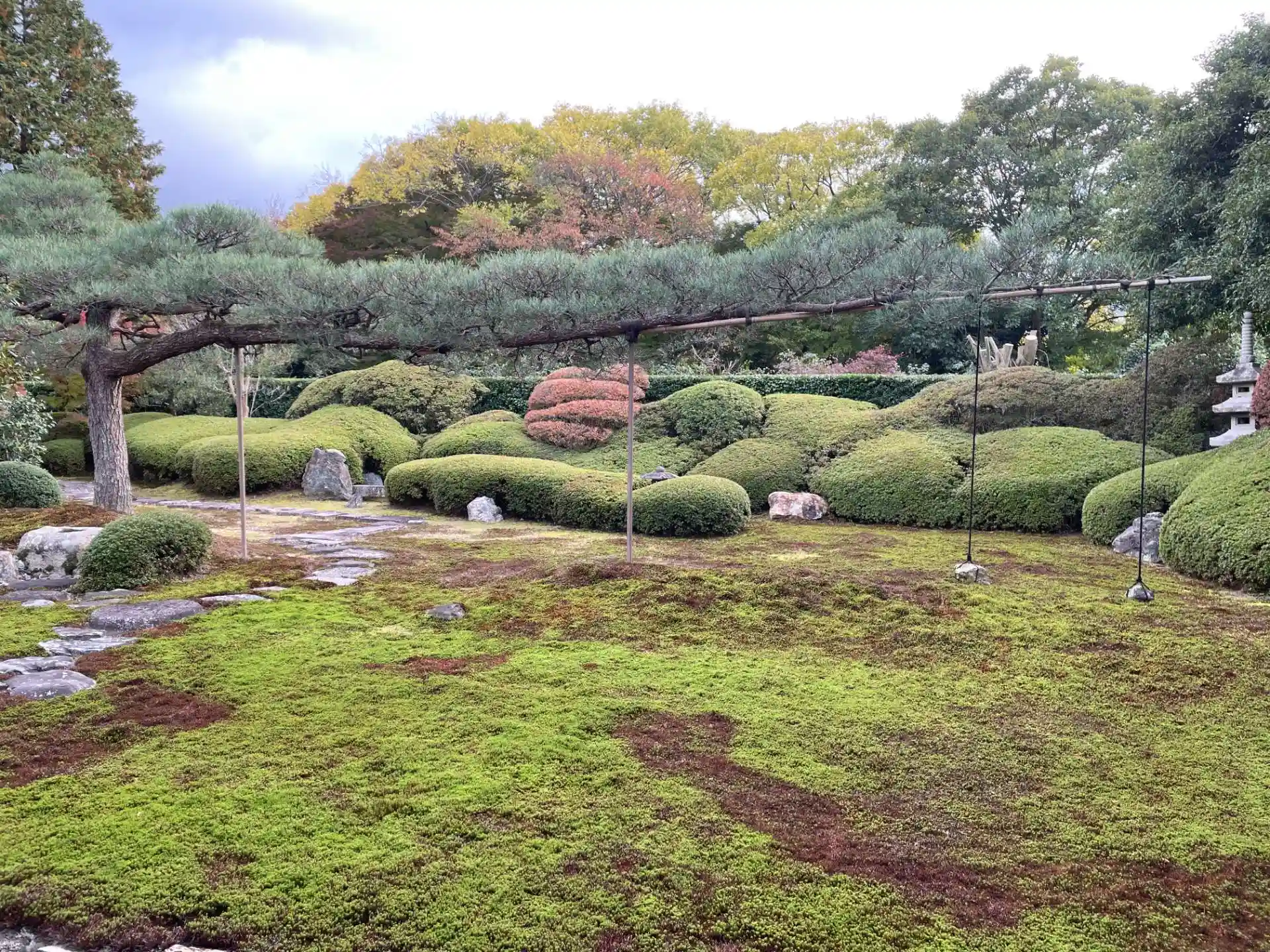 南庭は「依稀松(いきまつ)の庭」とも称され 松の枝が「朱雀」を 刈り込まれたサツキが背後の山々を表しているそうです。