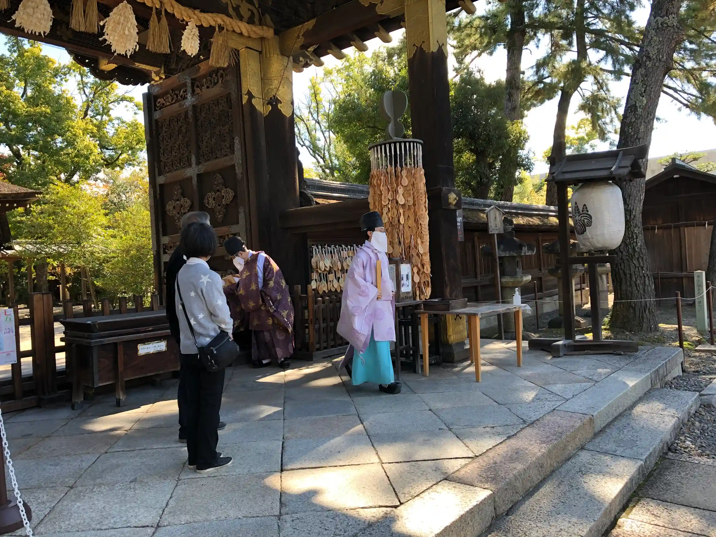 ここ豊国神社の唐門は 伏見城の城門だったと伝えられていて その後 二条城に移され さらに南禅寺の塔頭 金地院へ そして明治に入ってから豊国神社に移築されたということです🧐🌿西本願寺の唐門 大徳寺の唐門と合せて国宝の三唐門です🧐😲🌿総欅(けやき)作りで 扉の両面や屋根下の欄間には名工 左甚五郎による彫り物が施されていて 創建当時は彫刻などに 金箔が施されていた と伝えてられています✨🥹🌿