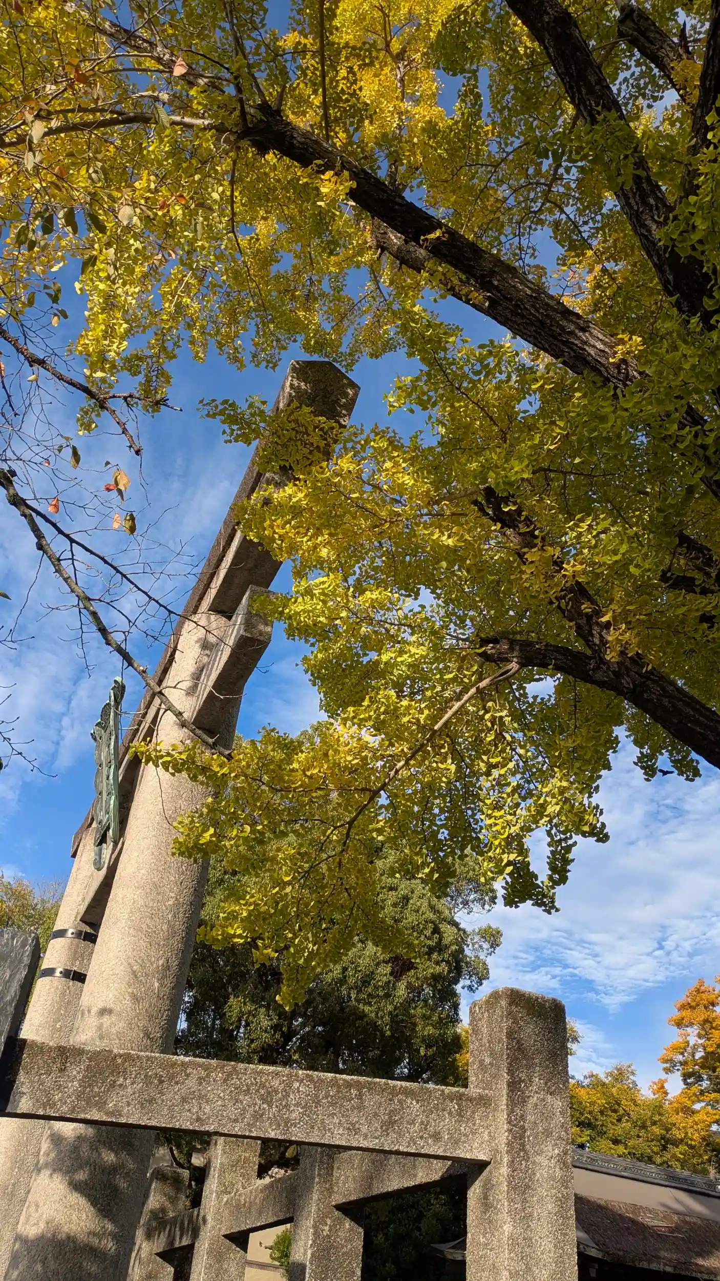 鳥居と銀杏。写真だと黄色く見えますが肉眼だとまだまだでした