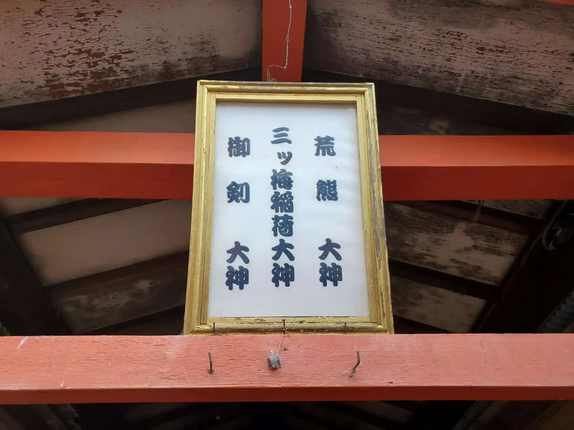 ネットで2年ほど前の三ツ梅稲荷の画像があり、それによると一つ目の鳥居に「三ッ梅稲荷大神」の扁額が掲げられていて、三つ目の鳥居には「荒熊大神」の扁額がかかっていたようです。