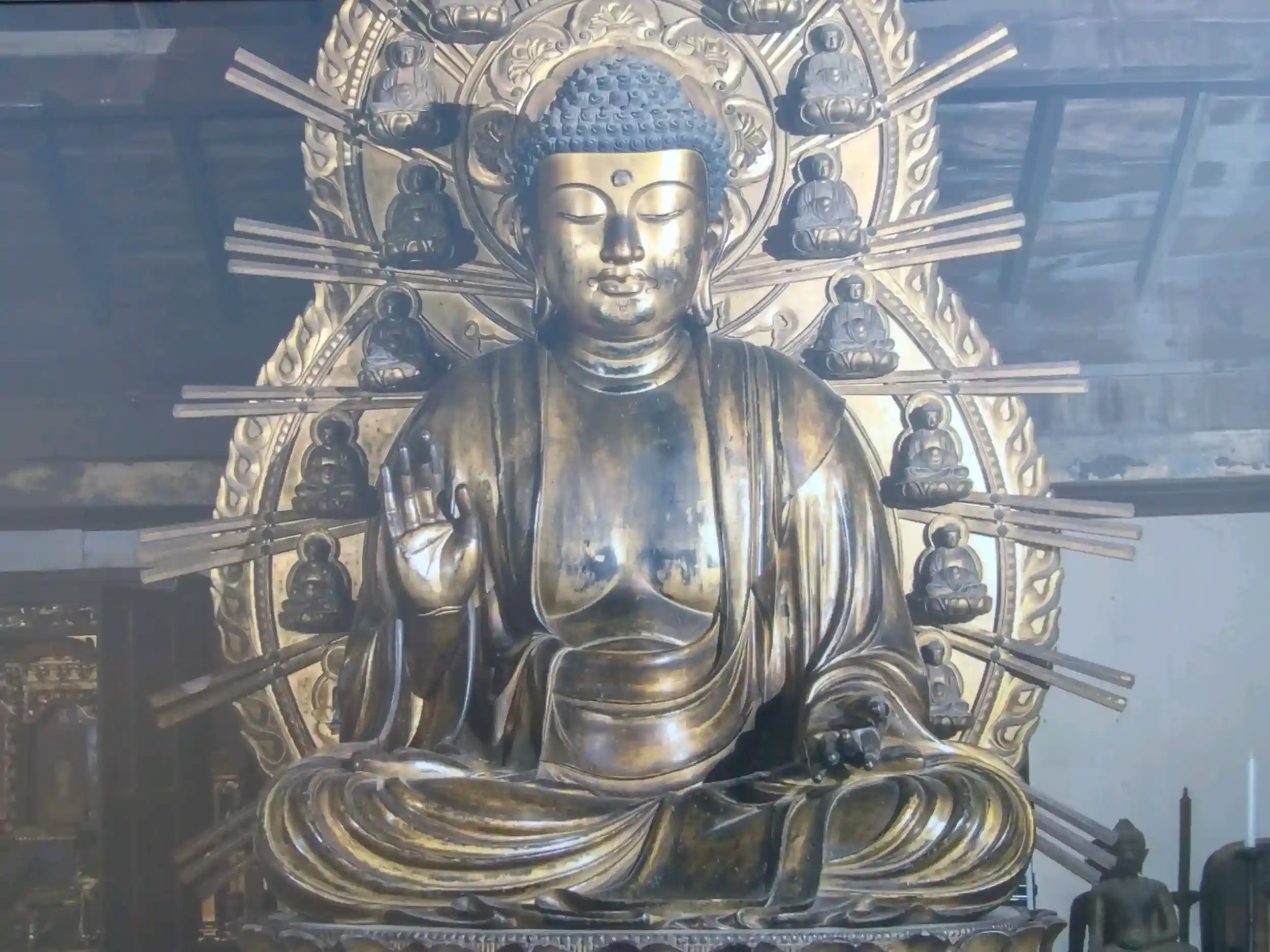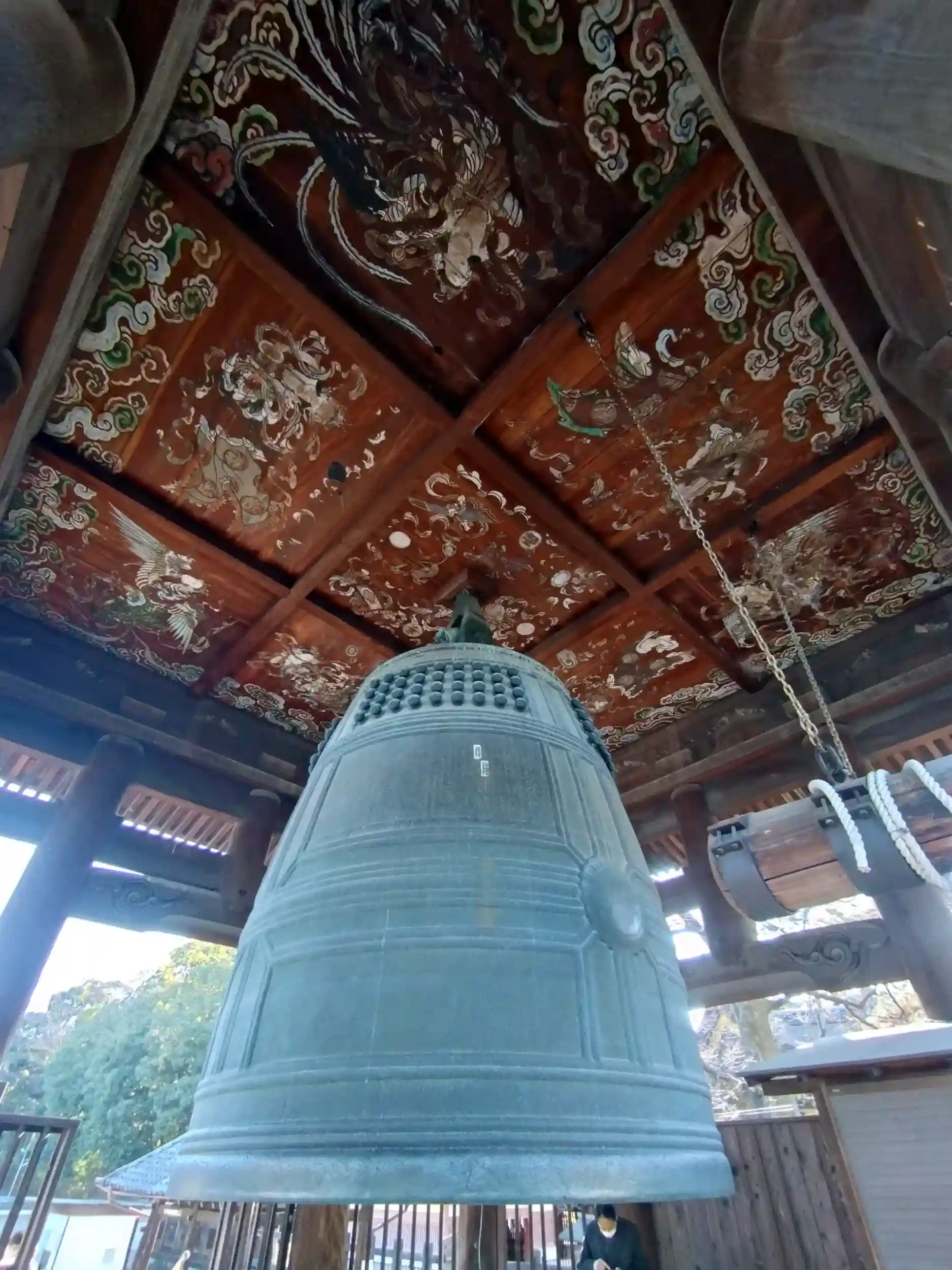 豊臣秀吉が、奈良の東大寺を模して京に大仏を祀るために創建。天災で大仏と大仏殿は失われたが、「国家安康 君臣豊楽」の銘文からの"いちゃもん"による「大坂冬の陣」のきっかけとなった梵鐘(重文)は現存。今回、10分の1の大きさで江戸期に造られた本尊の盧舎那仏坐像、大仏殿の欄間に施されていた左甚五郎作の龍の彫刻(部分)、大仏の白毫に収められていたという眉間籠り仏、秀吉が護持したという手のひら大の小さな大黒天像、天井画として描かれた巨大な掛軸「神龍図」が特別公開されている。また、有名な梵鐘の中を覗くこともでき、覗いてみると、淀君の・・・