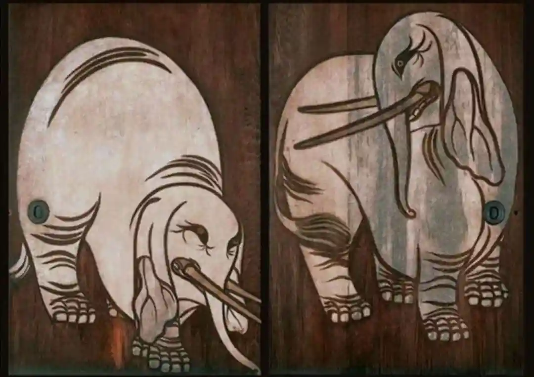 次に「白像図」の対面にある俵屋宗達筆の「麒麟図」、上を見ると「血天井」。当日が雨上がり後の曇り空だったため「ちょっと暗いのでわかり辛いかもしれませんが。」と言いながら差し棒を使って説明頂けると「あ、確かに。」という感じ。(血天井は割と残っていますね、何処で見たのか覚えがありませんが。岐阜市の寺院にもあります。)