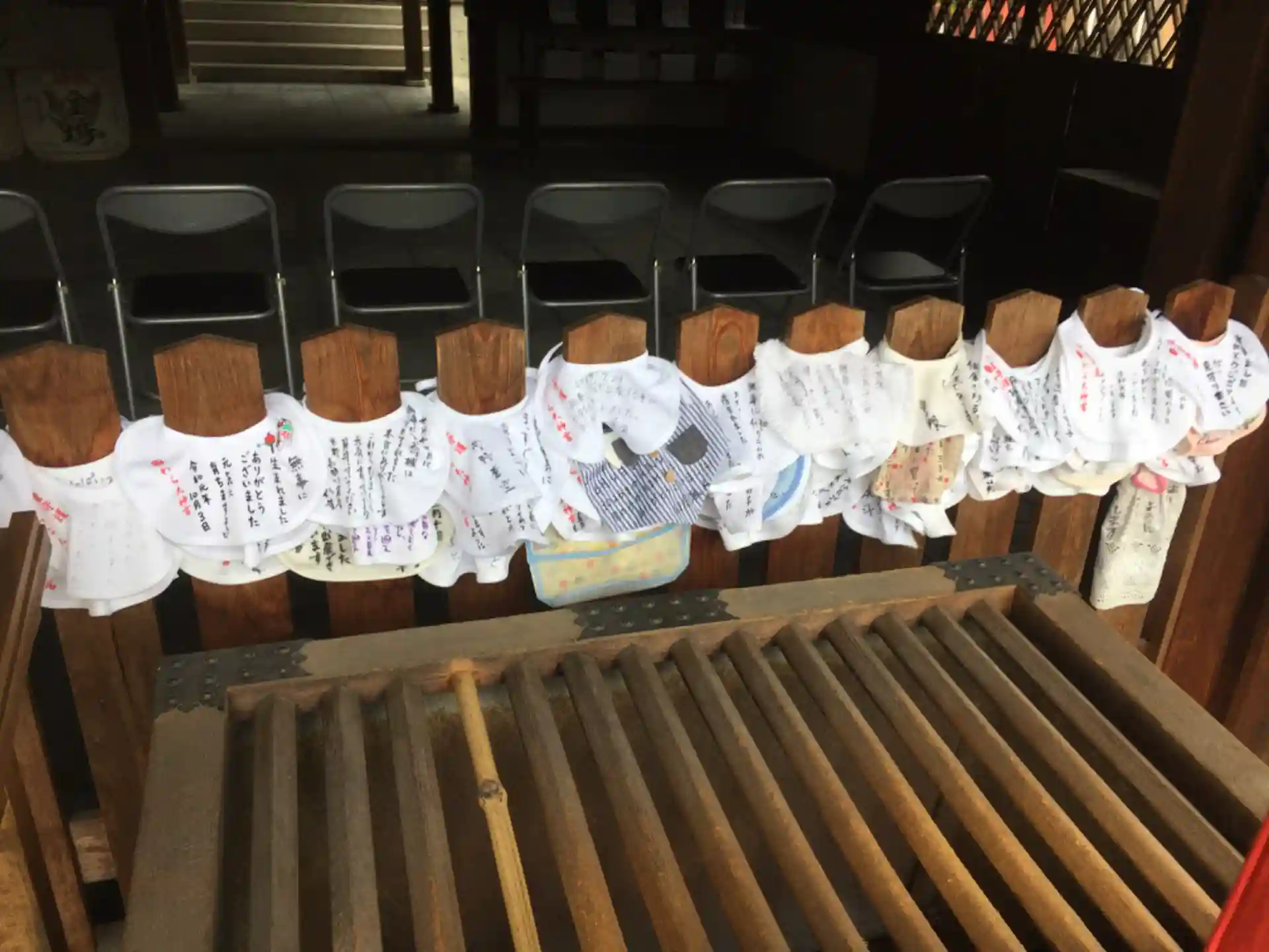 本殿の賽銭箱のすぐ奥に涎掛けの絵馬が沢山かかっているのがすごく印象的でした!
