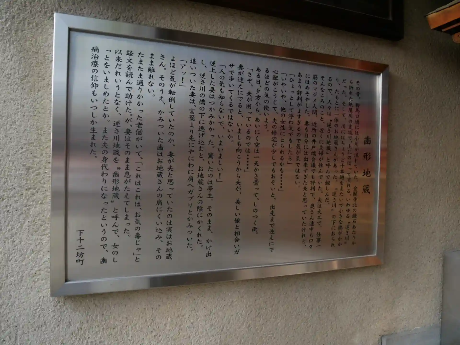 昔夫の浮気を疑った嫉妬深い奥さんのおはなし。怒った奥さんが夫の肩に齧り付いた。ところがそれはお地蔵様の肩。夫は後ろに隠れていた。齧り付いた歯は離れず、そのまま生き絶えた。お地蔵さまの肩に歯形がついて歯形地蔵と呼ばれるようになり嫉妬を戒めたと。