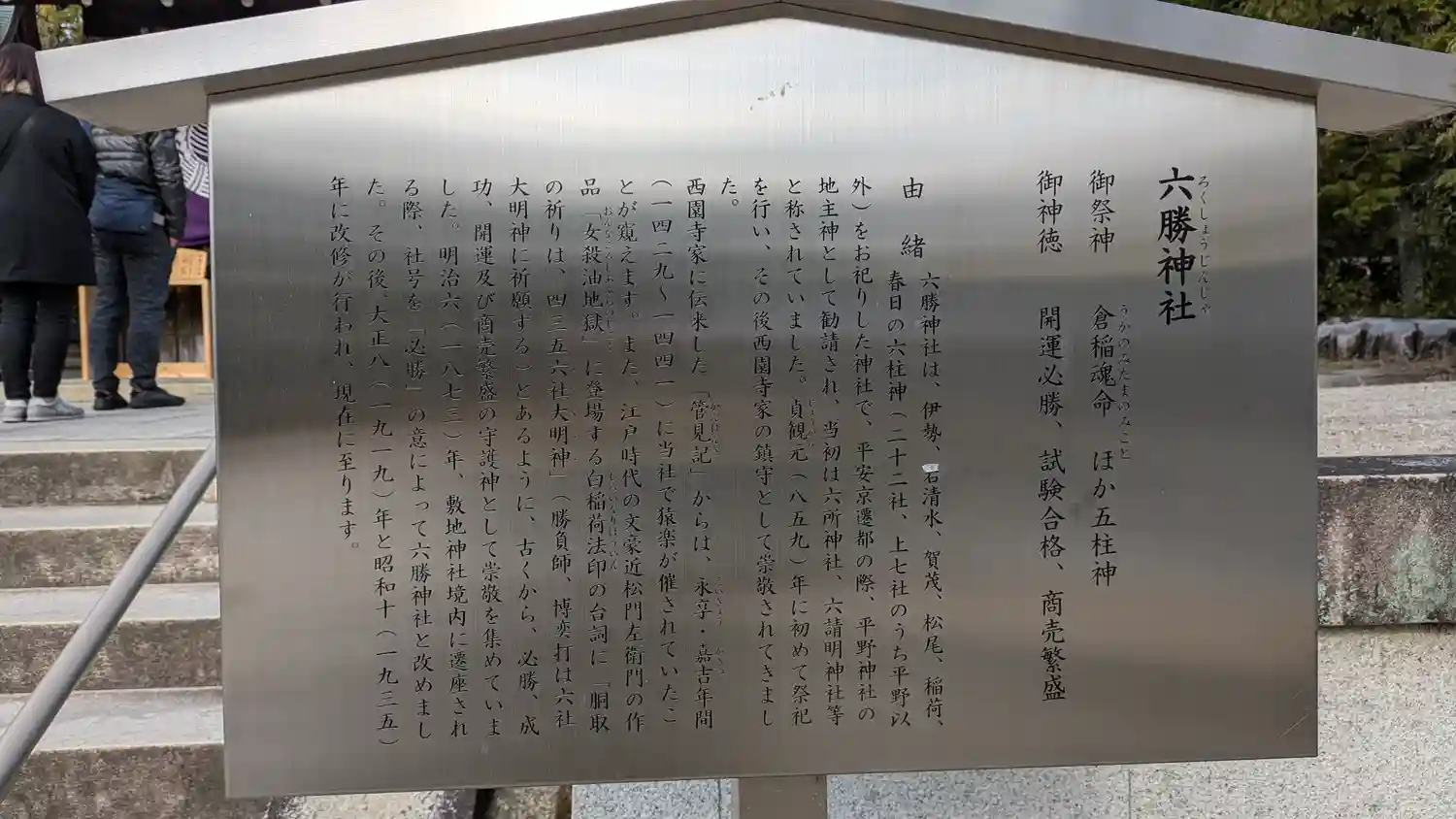 伊勢、石清水、賀茂、松尾、伏見、春日の六柱をお祀りする六所神社と呼ばれるお社で、平安時代には西園寺家の鎮守として崇敬されていたそうです。明治6年に敷地神社境内に遷座する際に必勝の意を込めて、六勝と改めて勝負事の神様として崇敬されます。