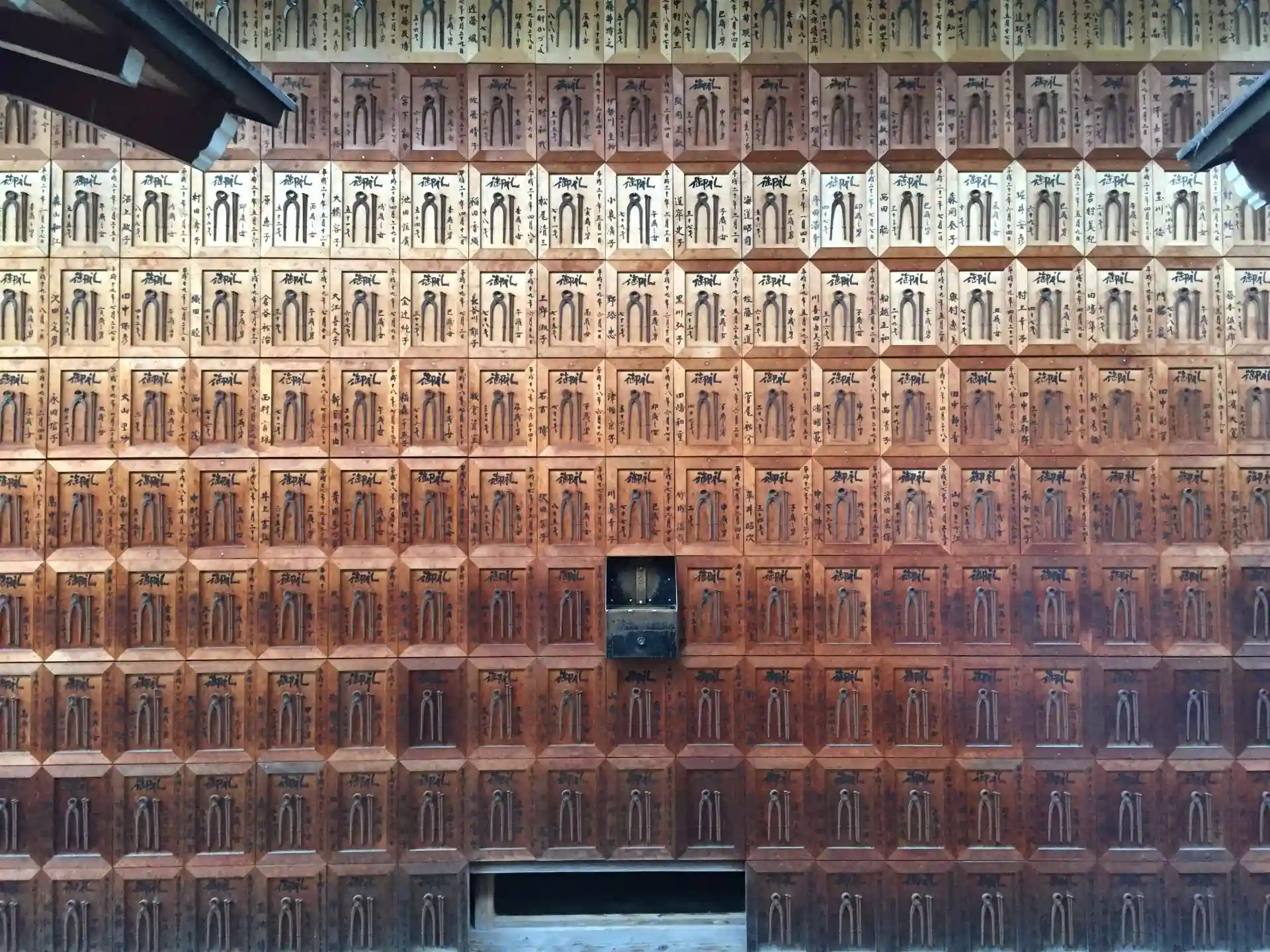 本堂の壁が釘とヤットコでできている。