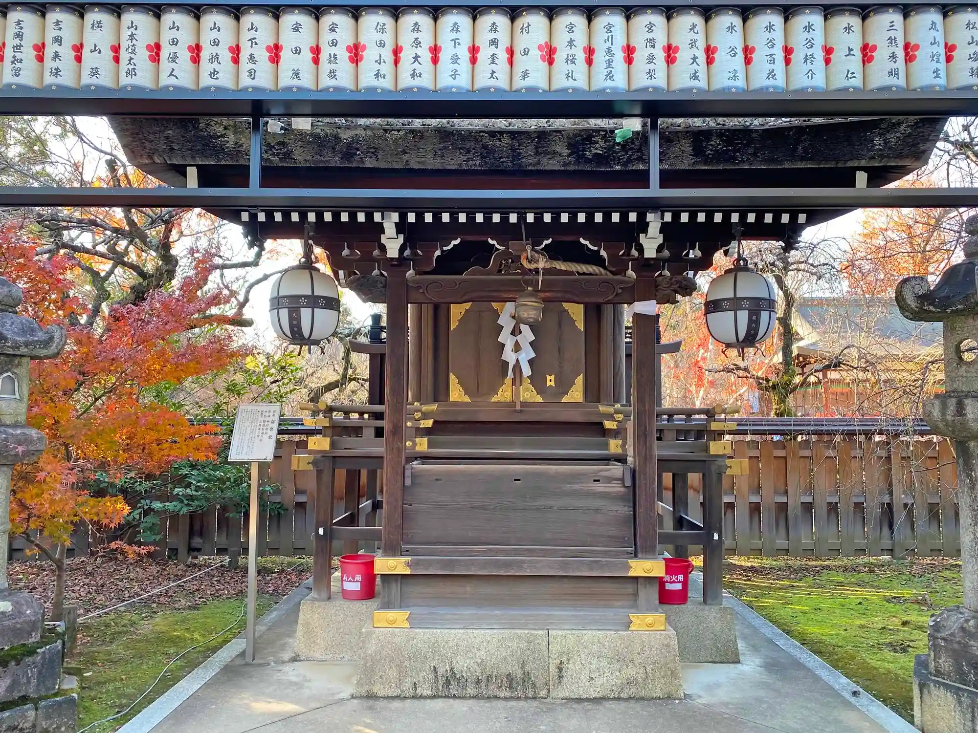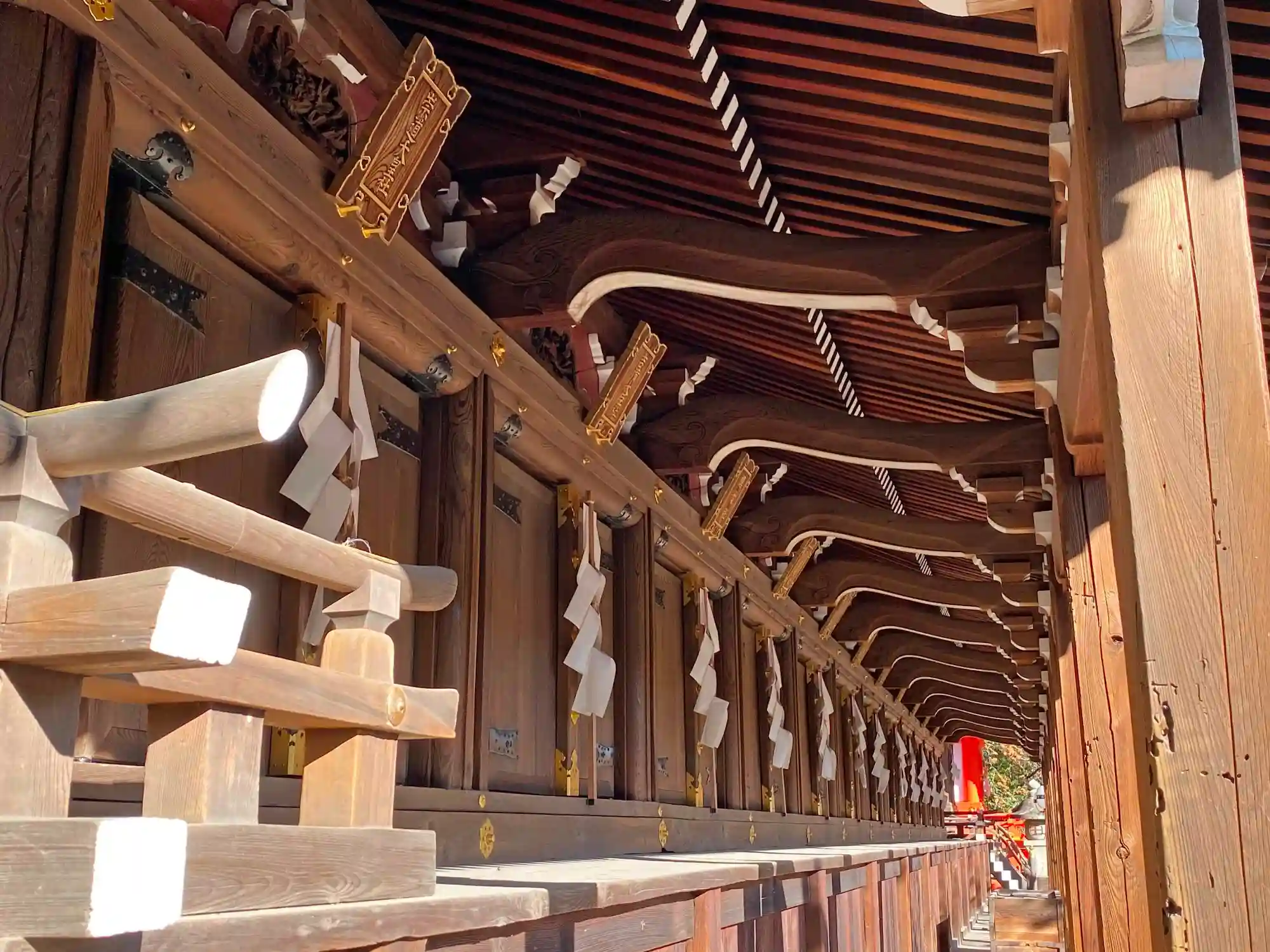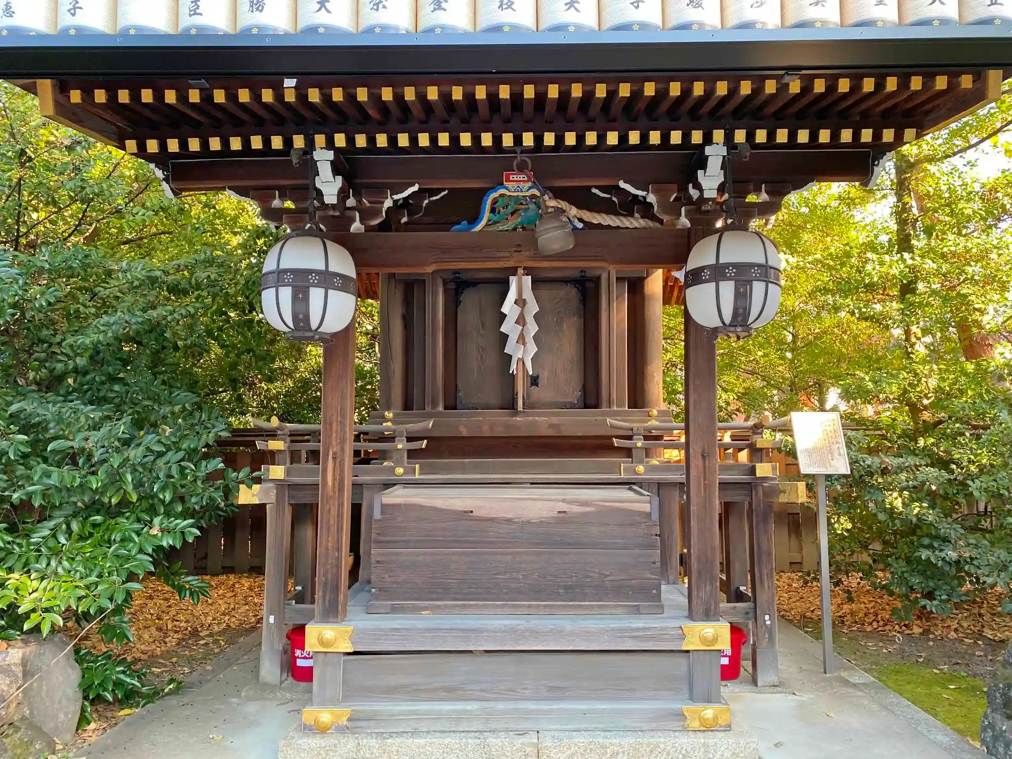 長屋形式の社殿でも、境内社ごとの扁額はピカピカ、紙垂はフレッシュ。さすが手入れが行き届いている。
