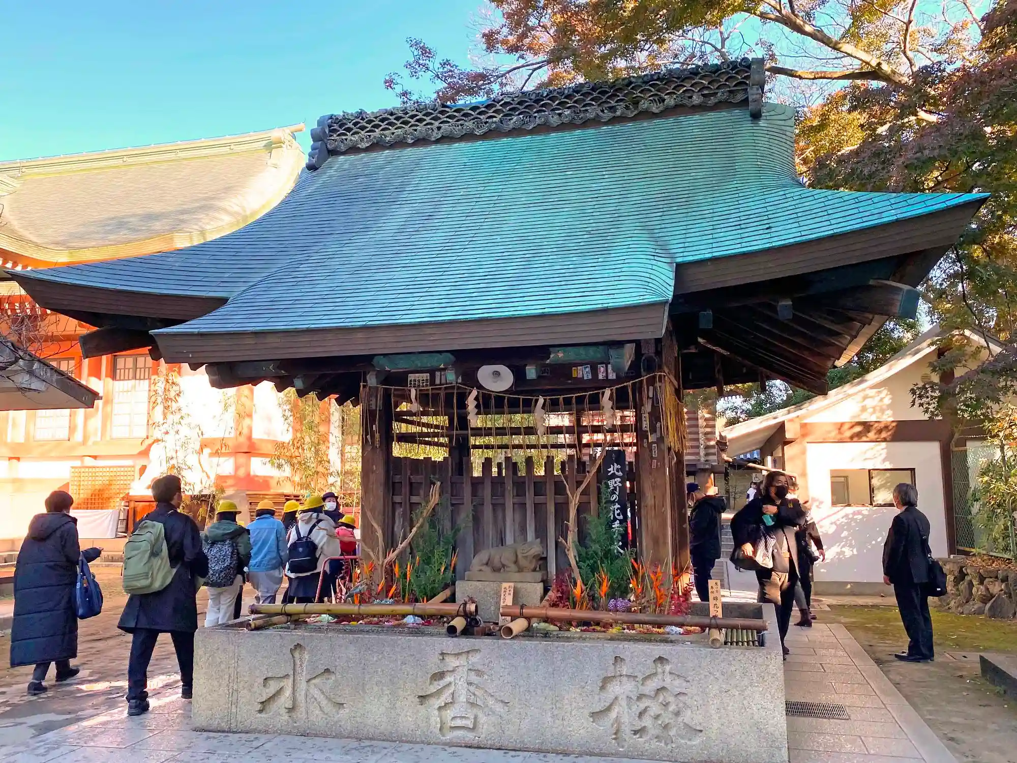 堂門をくぐって右側にある、立派な<手水舎>。<北野の花手水>というだけあって、とてもきれい。屋根が守っているのは手水盤や参拝者ではなく牛の像?...(^_^;)