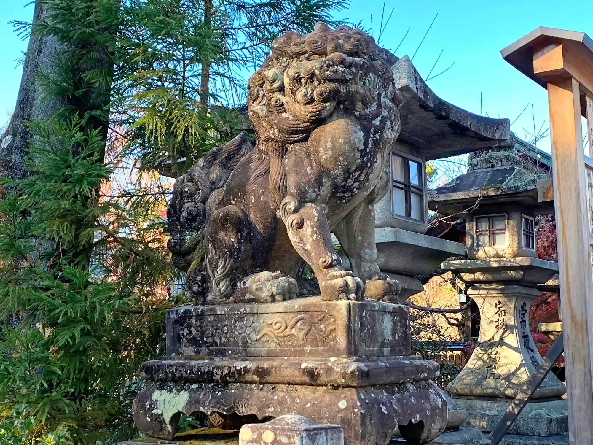 参道まで戻って、参道右側にある<狛犬>。当社では鳥居、楼門、三光門など参道上のいろんな場所に狛犬があるが、こちらの一対が最も古そうだったのでピックアップ。