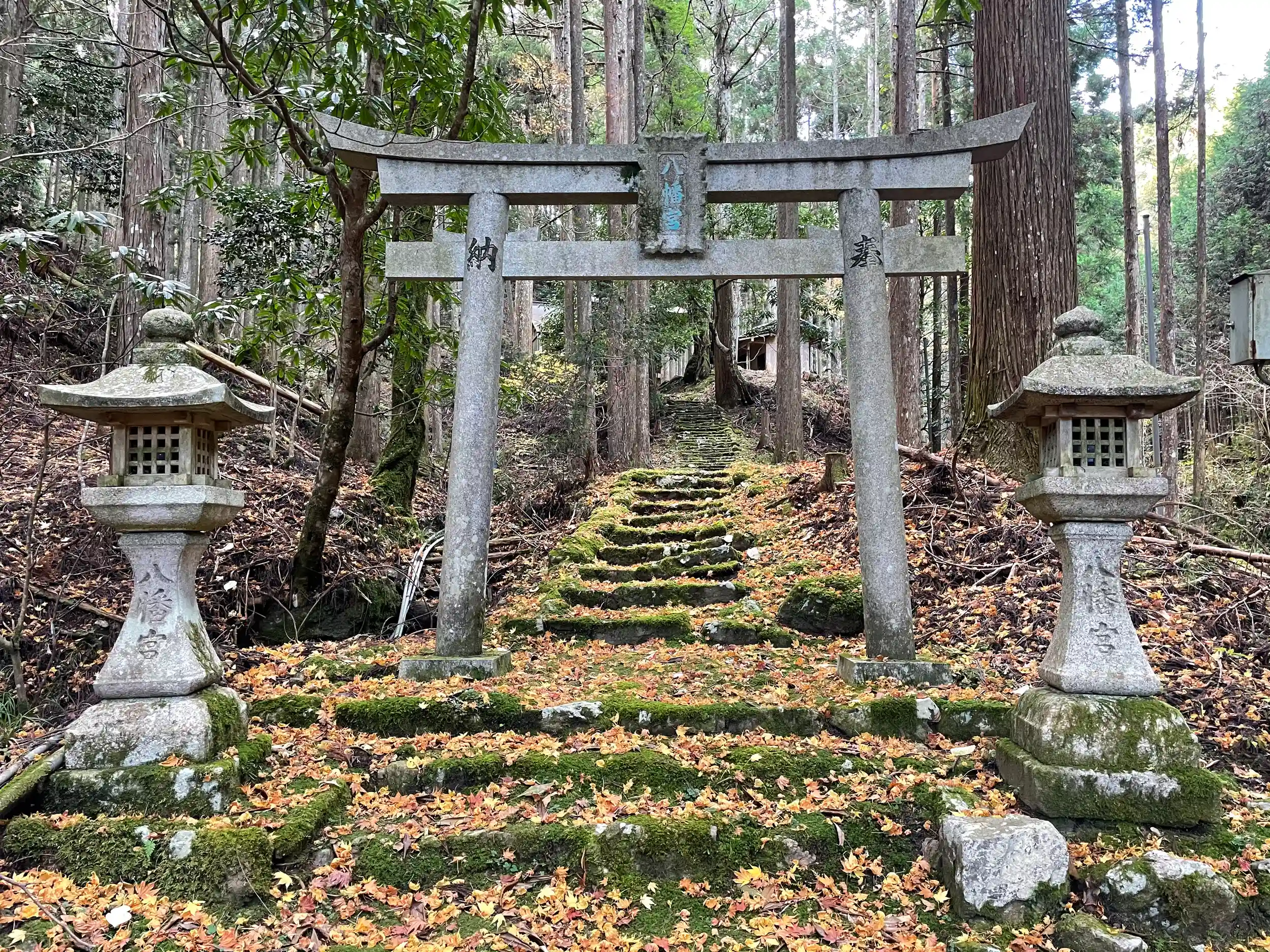 「八幡宮」の扁額の鳥居をくぐり、紅葉が敷かれ苔でふわっふわの階段を登り、正面舞台?右手に社務所?