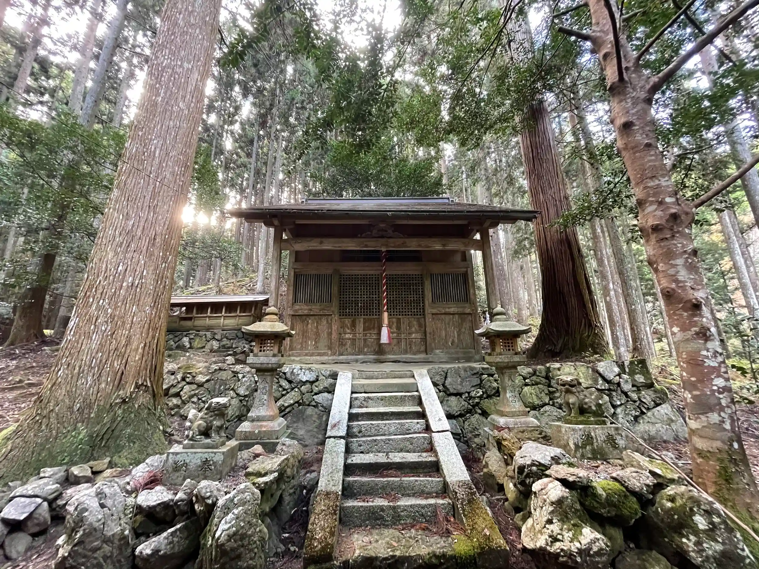 この辺は北山杉の産地であり、境内も背の高い北山杉が並び鬱蒼と茂って暗い。雰囲気はあるけど、ふわっふわの苔階段が「転けたら終わりだな...」と思わせる。真弓の鎮守社。