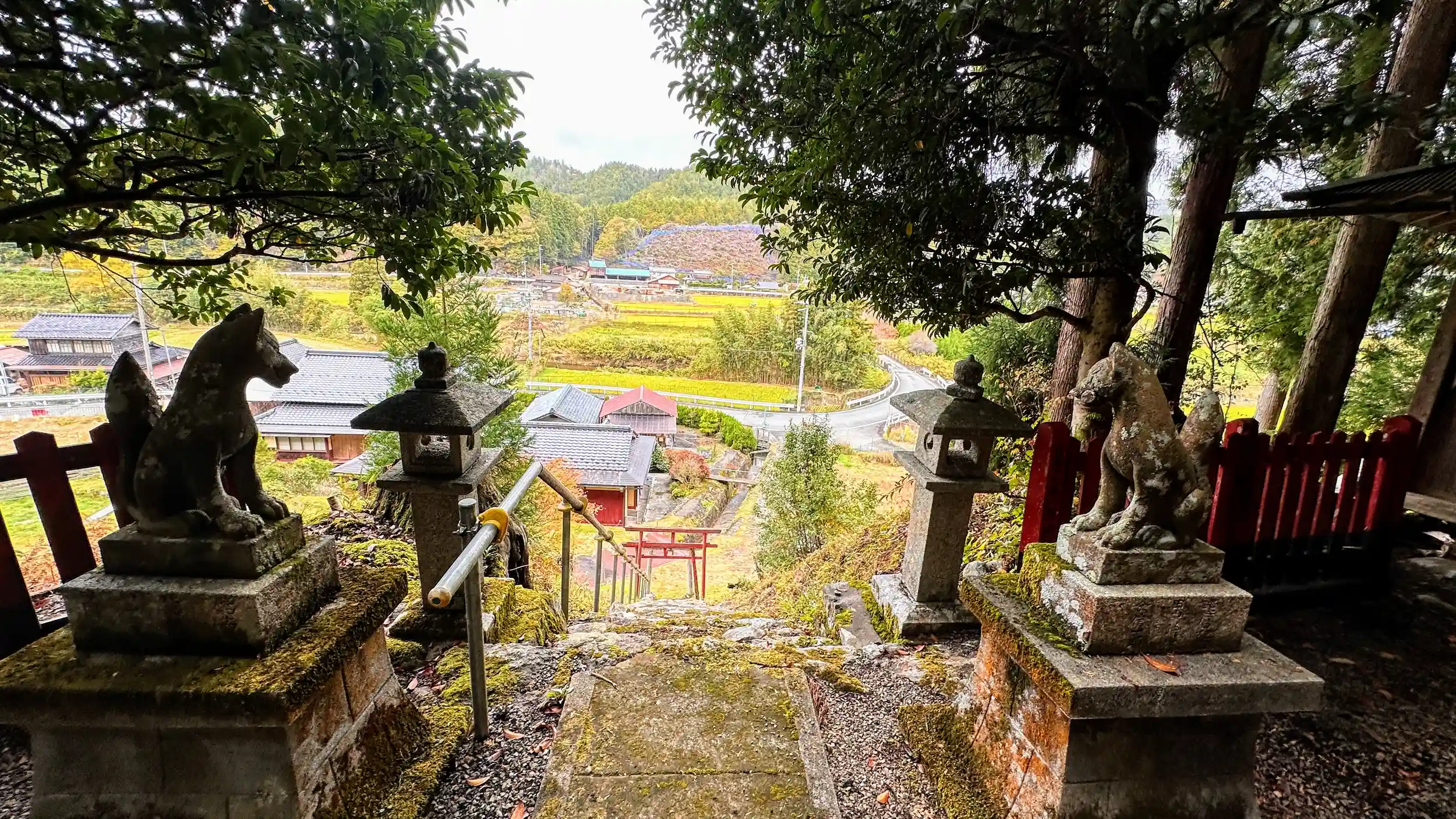 野上橋を渡つたところの山麓に鎮座されています、参道の階段には、一の鳥居がありそのあとに四連の赤い鳥居があります、以前は六連だったそうです、ご由緒は分かりません、境内より下の景色が見えます、