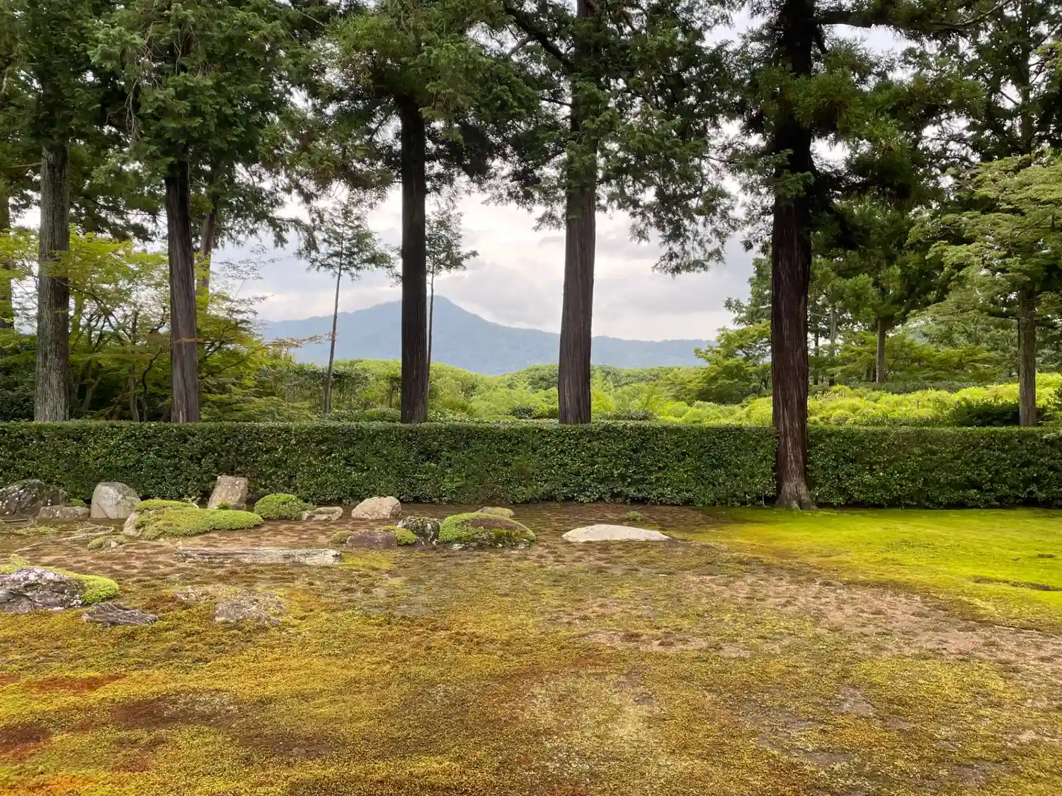 また 刈込みと立木の背後に望む比叡山を借景としている。