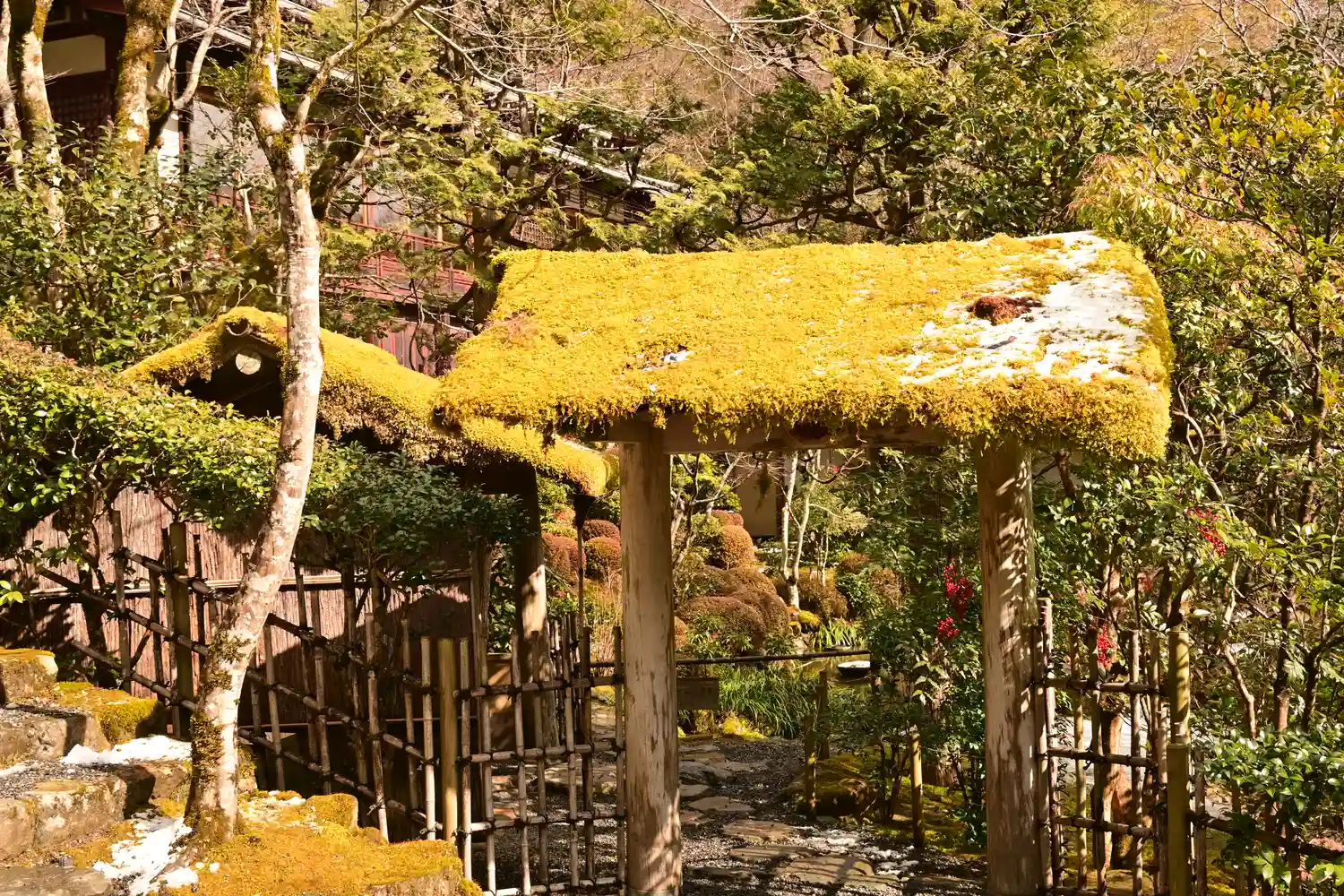 本堂前西側の風情ある庭園は『平家物語』にも描かれるもので、心字池を中心に千年の姫小松や汀の桜、苔むした石のたたずまいが好ましい風情をかもしだしている。