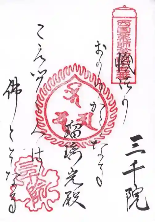 御詠歌「懺法の おのづからなる 瑠璃光殿 こえ聞く人は 佛となるぞ」と書かれ、右上に西国薬師第四十五番の印、真ん中に梵字(阿弥陀如来、観音菩薩、勢至菩薩)の火炎宝珠印、左下に三千院の印が押されています。