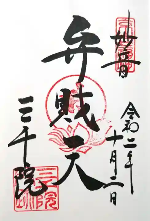 真ん中に弁財天と書かれ、右上に京之七福神の印、真ん中に蓮華座に梵字(弁財天)の印、左下に三千院の文字、三千院門跡の印が押されています。