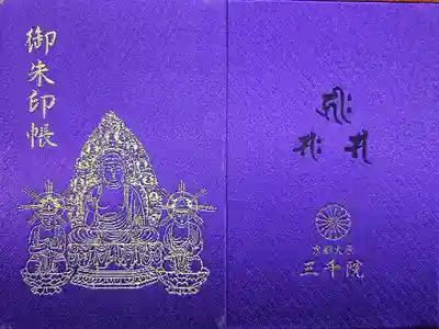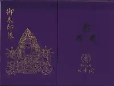 紫色の地に、表面は阿弥陀三尊がデザインされ、左上に御朱印帳の文字、裏面は真ん中に梵字(阿弥陀如来、観音菩薩、勢至菩薩)、下部に寺紋と「京都大原 三千院」の文字が入っています。