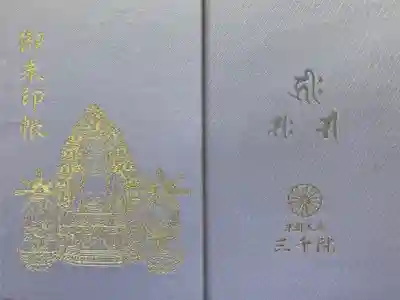 白色の地に、表面は阿弥陀三尊がデザインされ、左上に御朱印帳の文字、裏面は真ん中に梵字(阿弥陀如来、観音菩薩、勢至菩薩)、下部に寺紋と「京都大原 三千院」の文字が入っています。