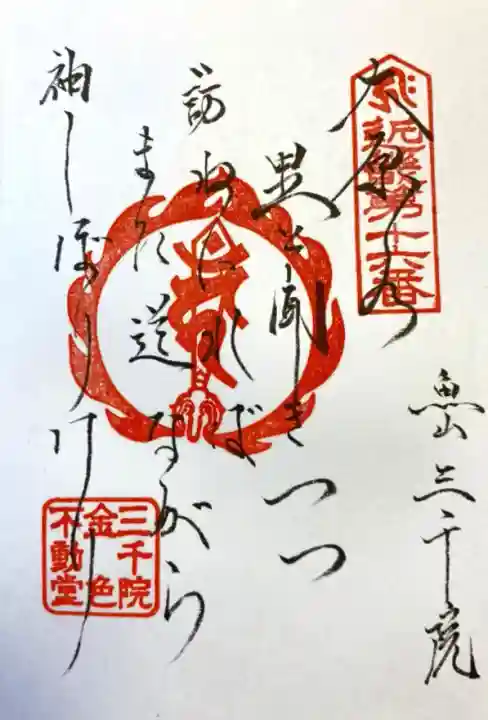 真ん中に金色不動尊と書かれ、右上に近畿第十六番の印、真ん中に梵字(不動明王)の火炎宝珠印、左下に三千院の金字、三千院金色不動堂の印が押されています。