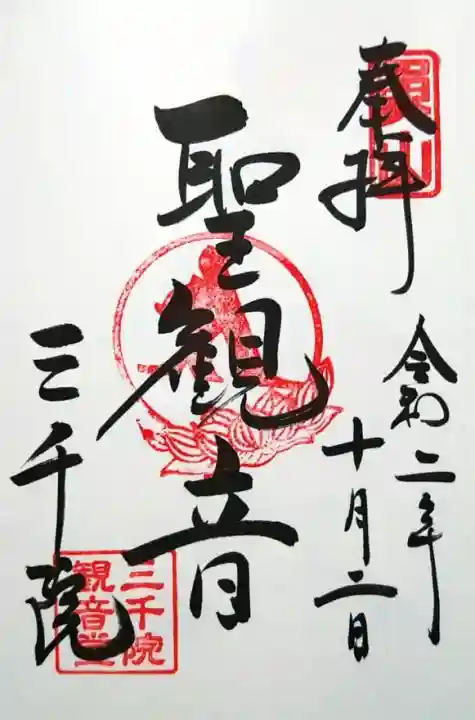 真ん中に聖観音と書かれ、右上に魚山の印、真ん中に蓮華座に梵字(聖観音)の印、左下に三千院の文字、三千院観音堂の印が押されています。