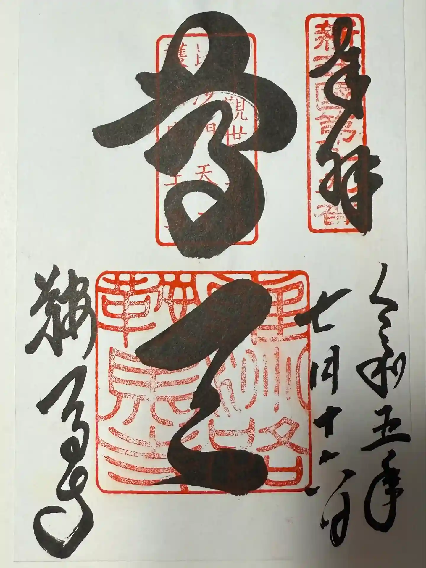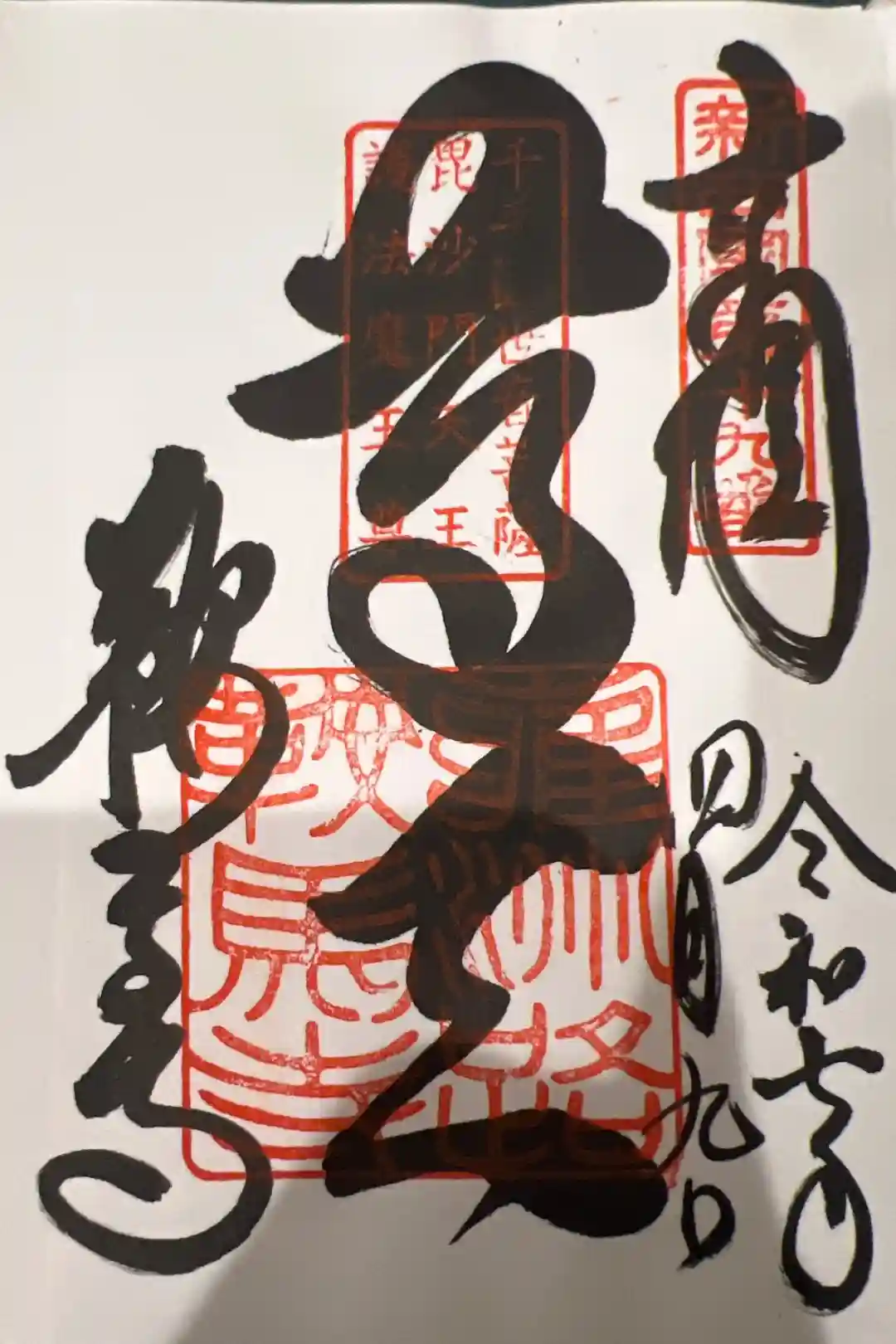 右から「新西国第十九番」、真ん中の上部に「千手觀世音菩薩 毘沙門天工 護法魔王尊」、下部に「雍洲路鞍馬寺」印が重ねられています。