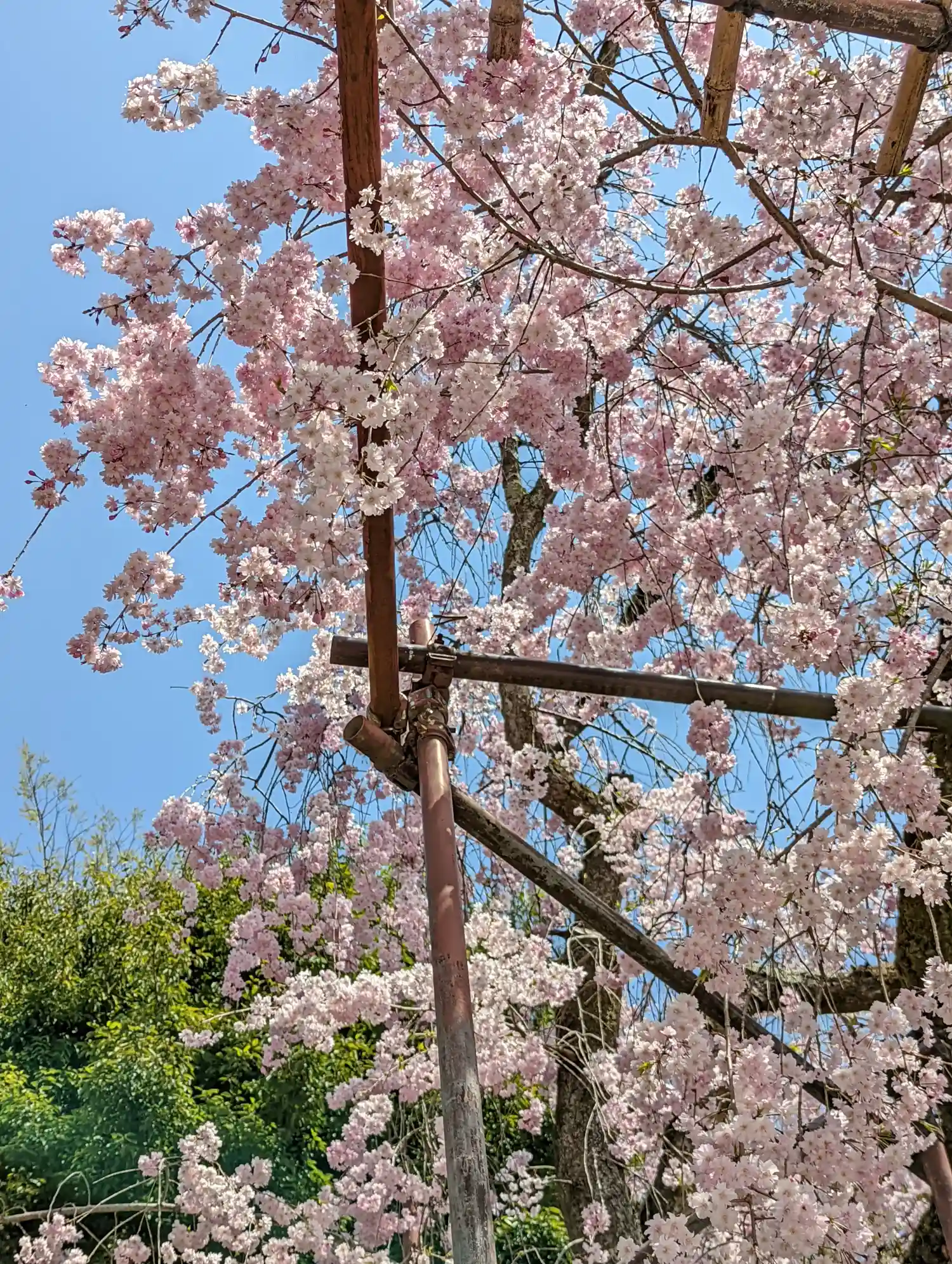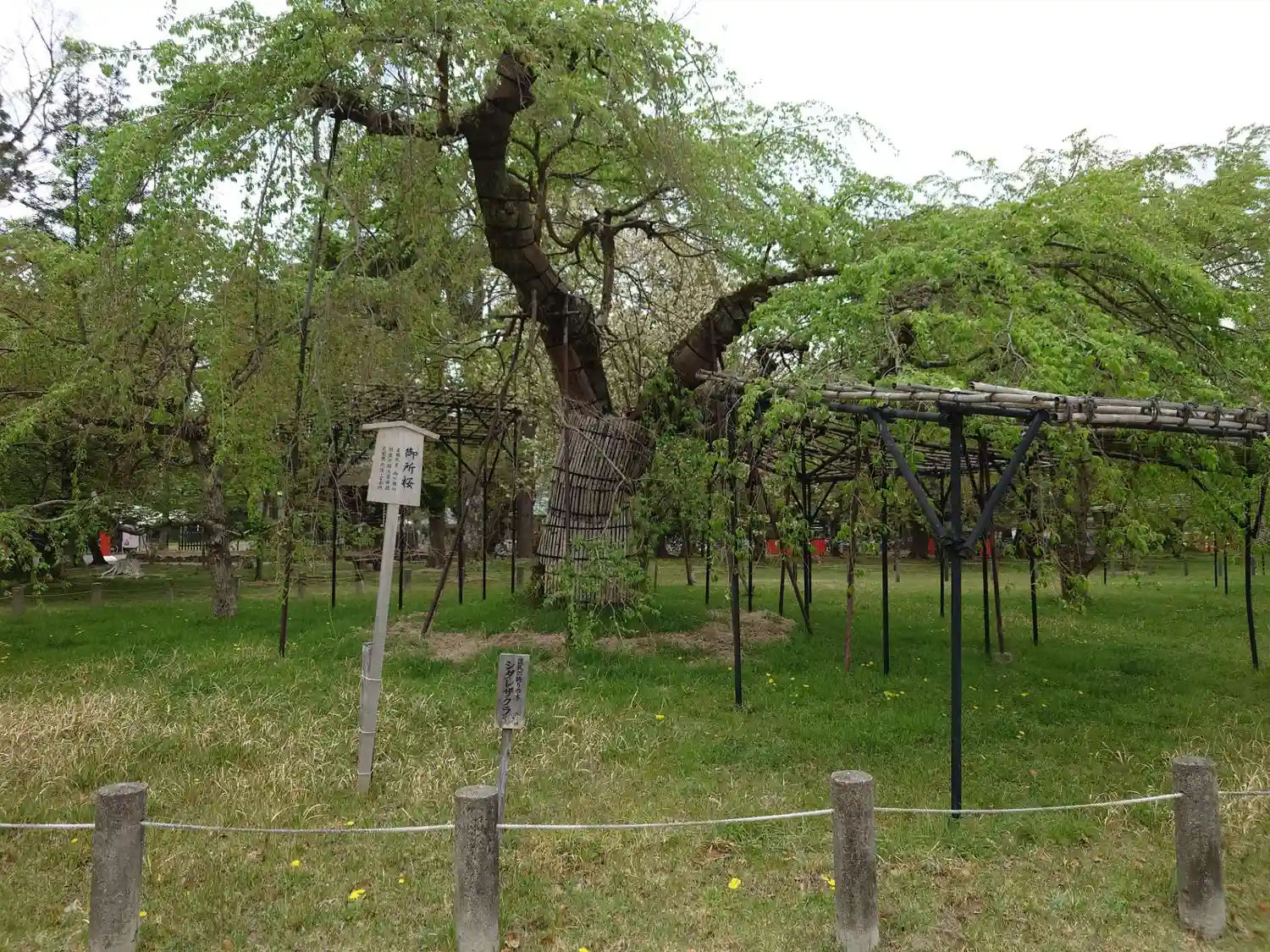 早咲きの御所桜は新緑に、そして遅咲きの斎王桜が見ごろを迎えたさま。