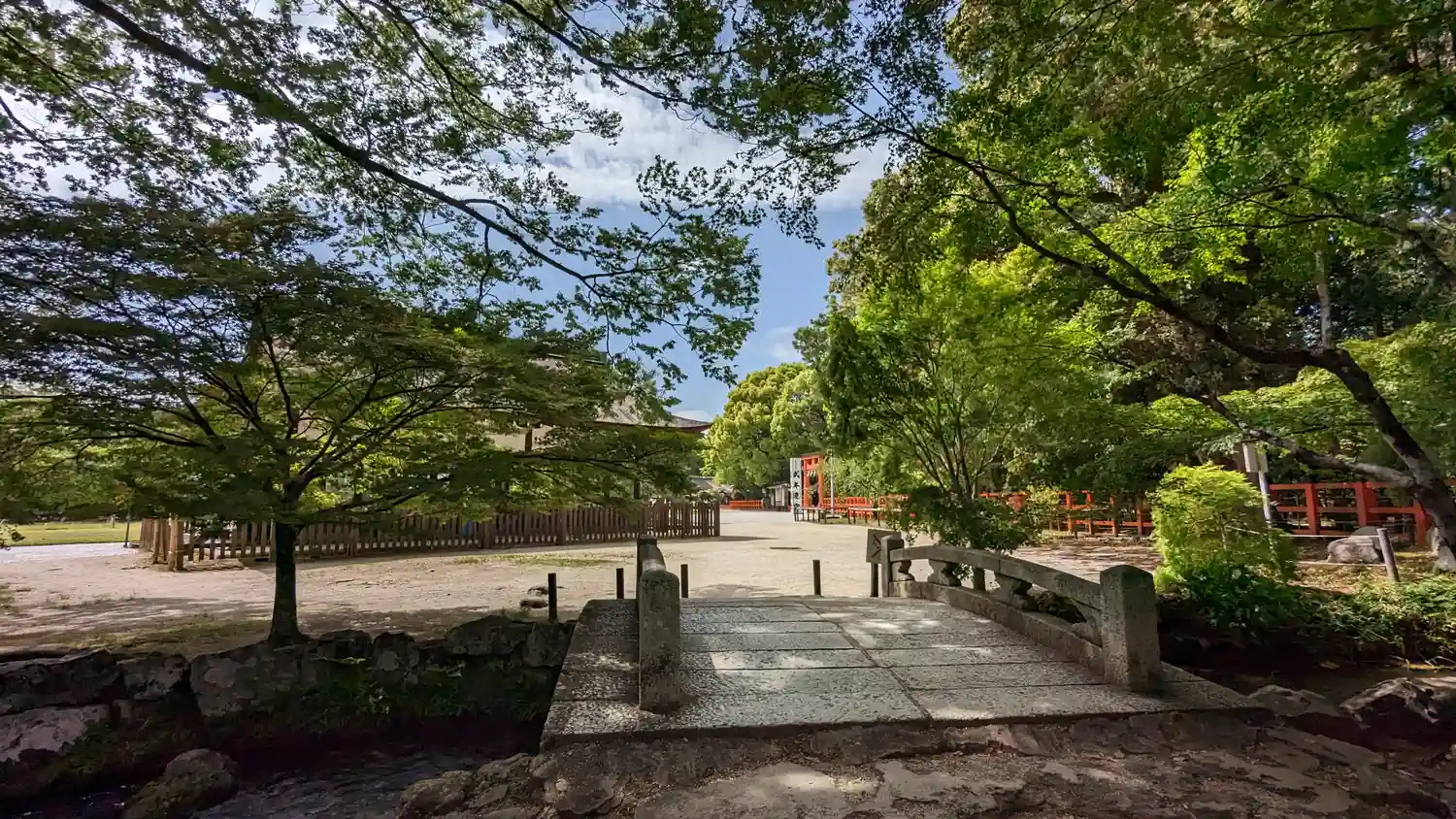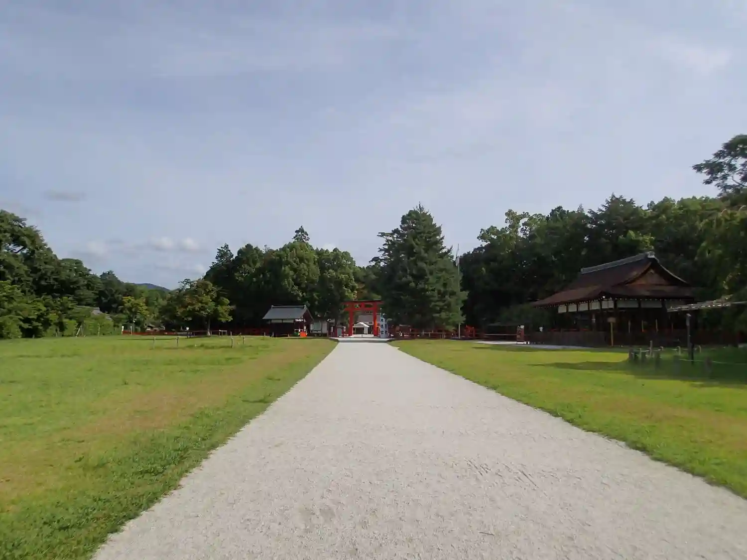 広々とした境内。中央に見えるのは細殿。