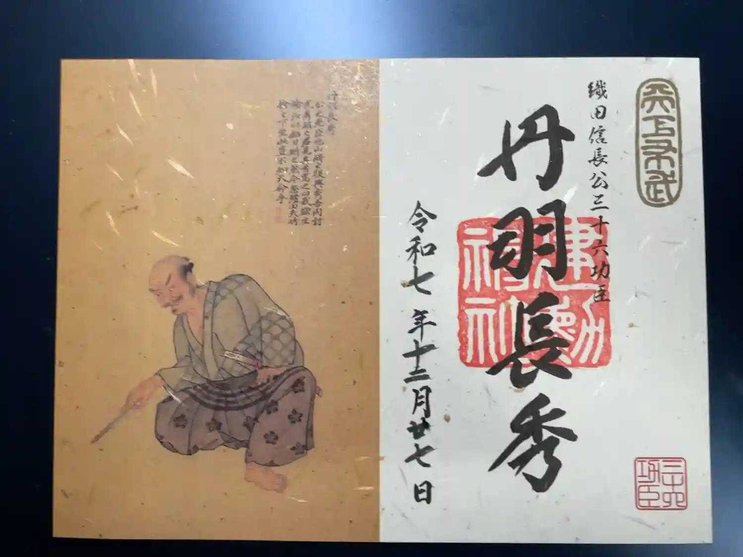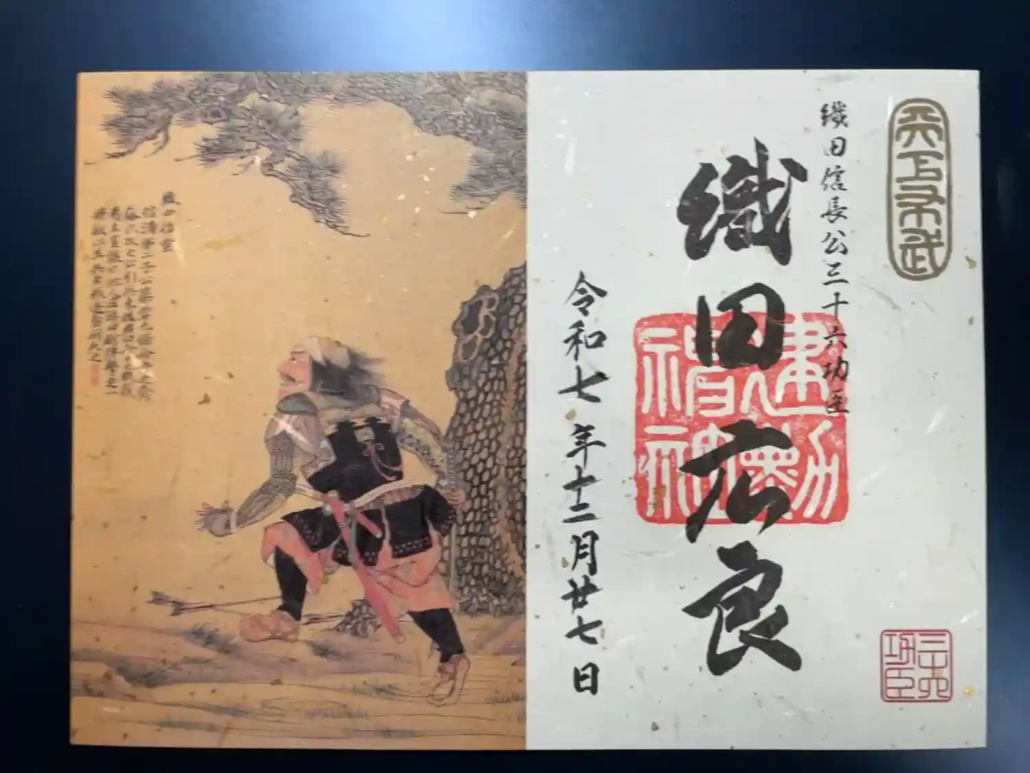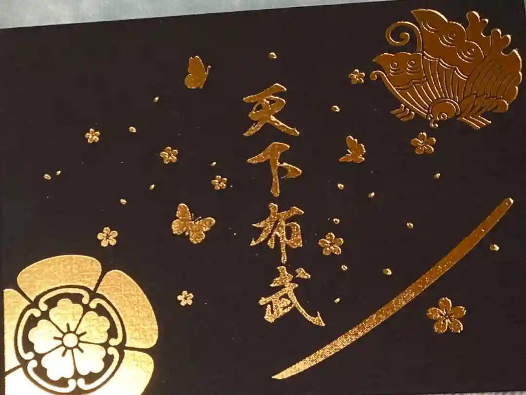 真ん中に大きく天下布武の印と、能の演目である敦盛の一節「人間五十年 下天のうちをくらぶれば 夢まぼろしの如くなり ひとたび生を得て 滅せぬもののあるべきか 敦盛」の文字、右下に敦盛を舞う信長公のお姿、左上に織田家の家紋のひとつの揚羽蝶紋、左下に建勲神社の印が入っています。