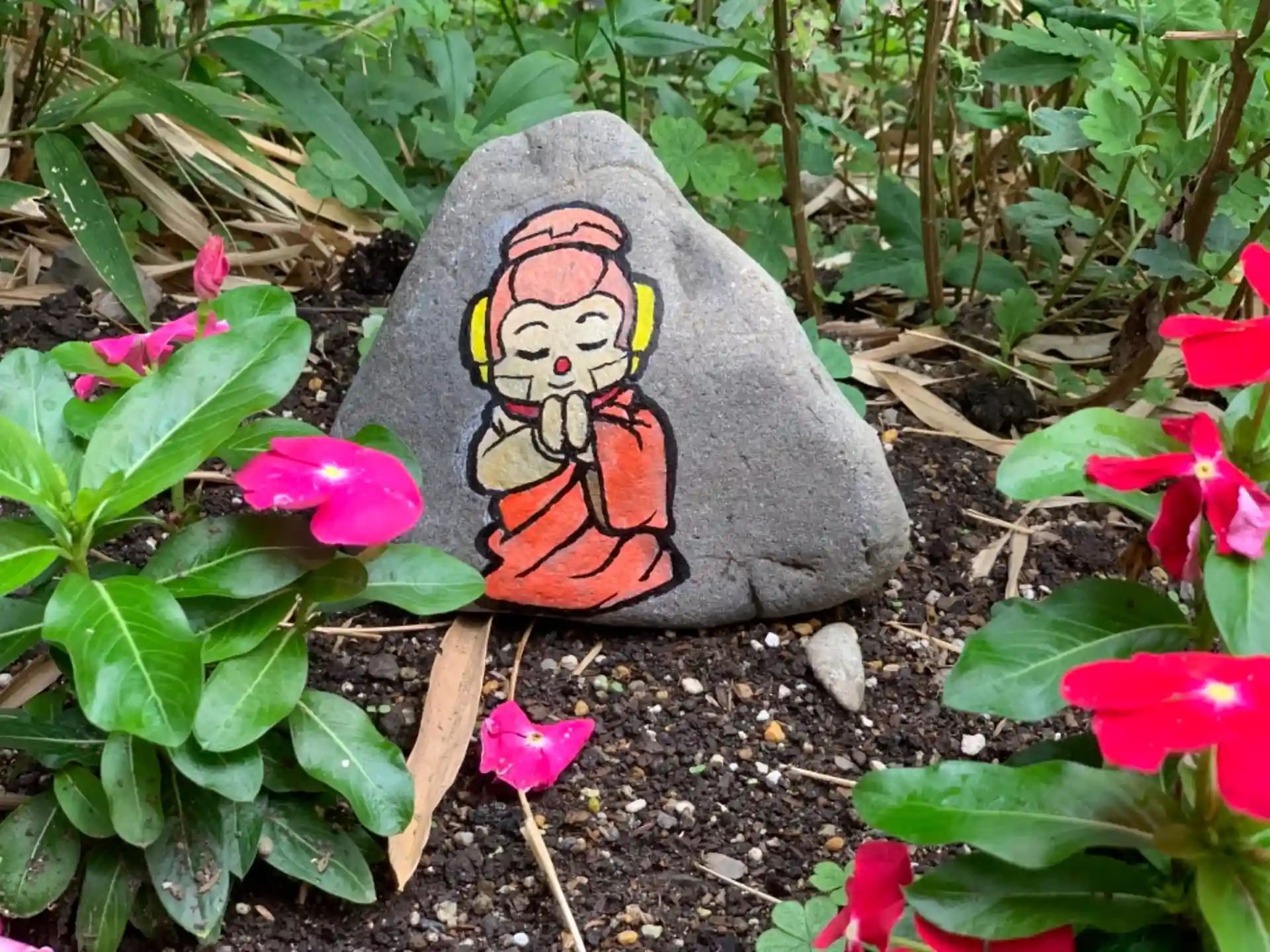 石仏のシャカもん完成したので庭に置いてみた。