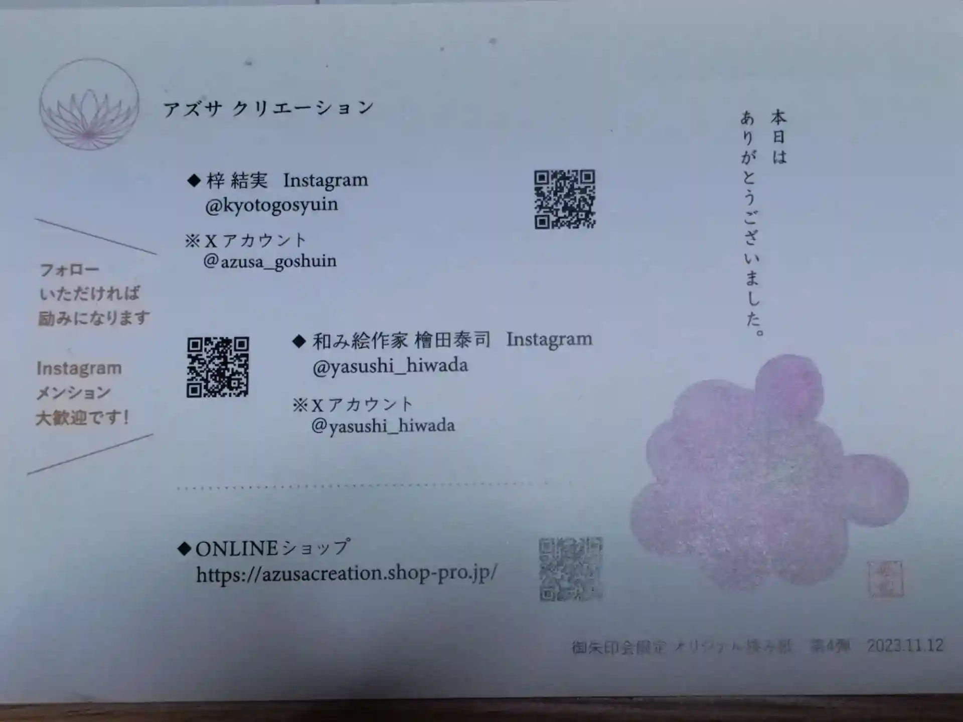 11月の尊陽院×日體寺×アズサクリエーションのコラボ御朱印イベントで預けていた、御朱印帳が届きましたので投稿させて頂きました。